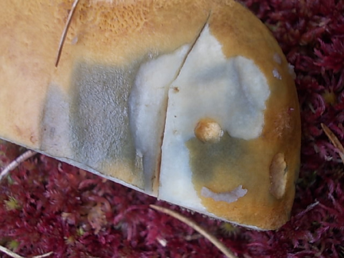 ich hätte die Röhrlinge am Anfang nicht für Ziegenlippen = Xerocomus gehalten, sondern für Xerocomellus bzw. Hortiboletus. Die oberen Bilder könnte ich mir als X. porosporus vorstellen, aber die späteren sehen eher nach H. engelii aus. Zumindest die Hutfarben letzterer wären sehr untypisch für Xerocomus und auch die Oberfläche sehr glatt und kein bischen samtig-filzig. Außerdem das Blauen im Fleisch ist eher ein Merkmal von Rotfußröhrlingen s.l. als von Ziegenlippen.