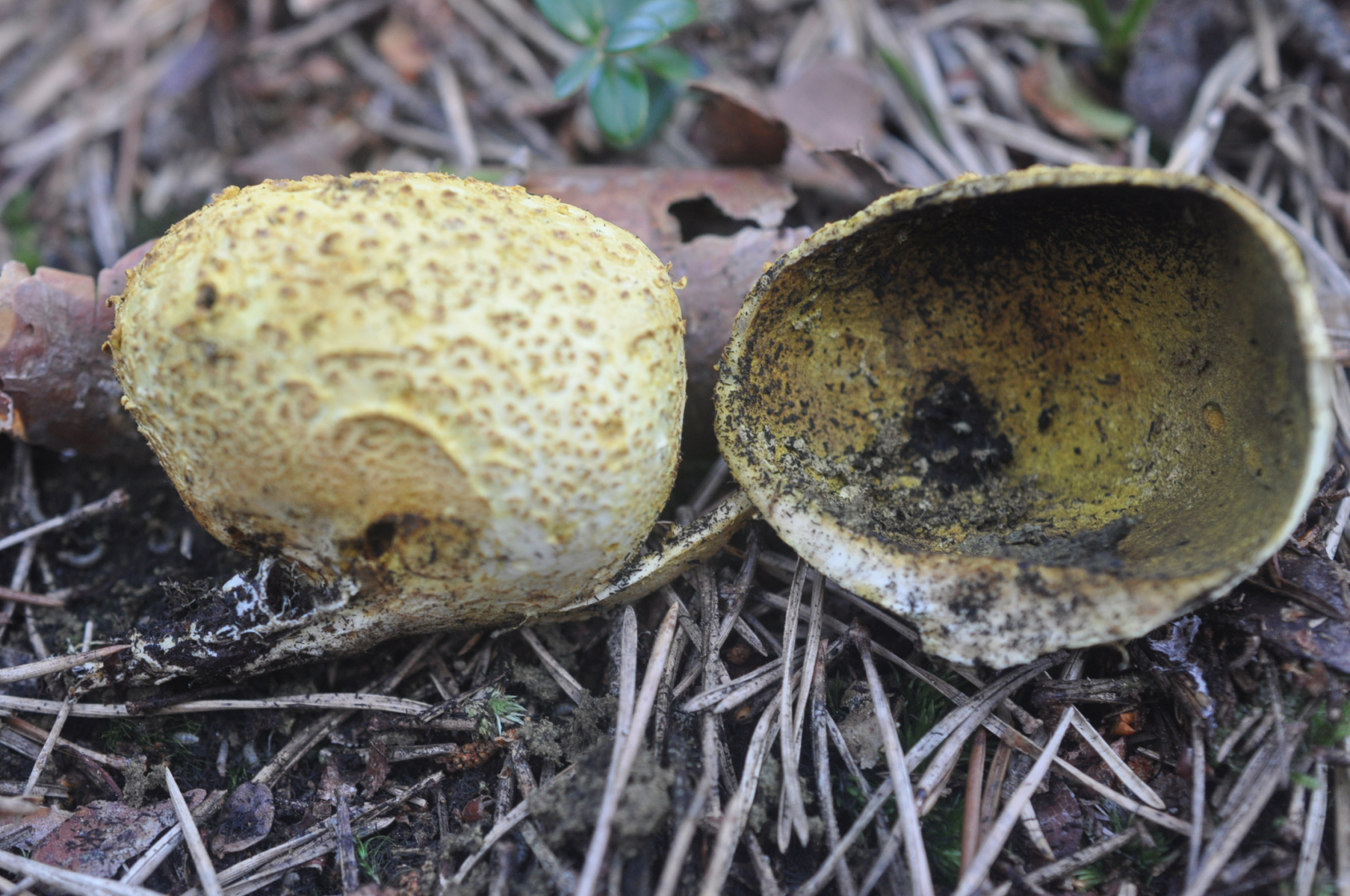 Hut : bis 10 cm Durchmesser , hell olivgelbe bis olivbraun in Alter hell Dunkelbraun mit feine braun weißliche Schüppchen . Rand blasser - verbogen meist etwas gerieft