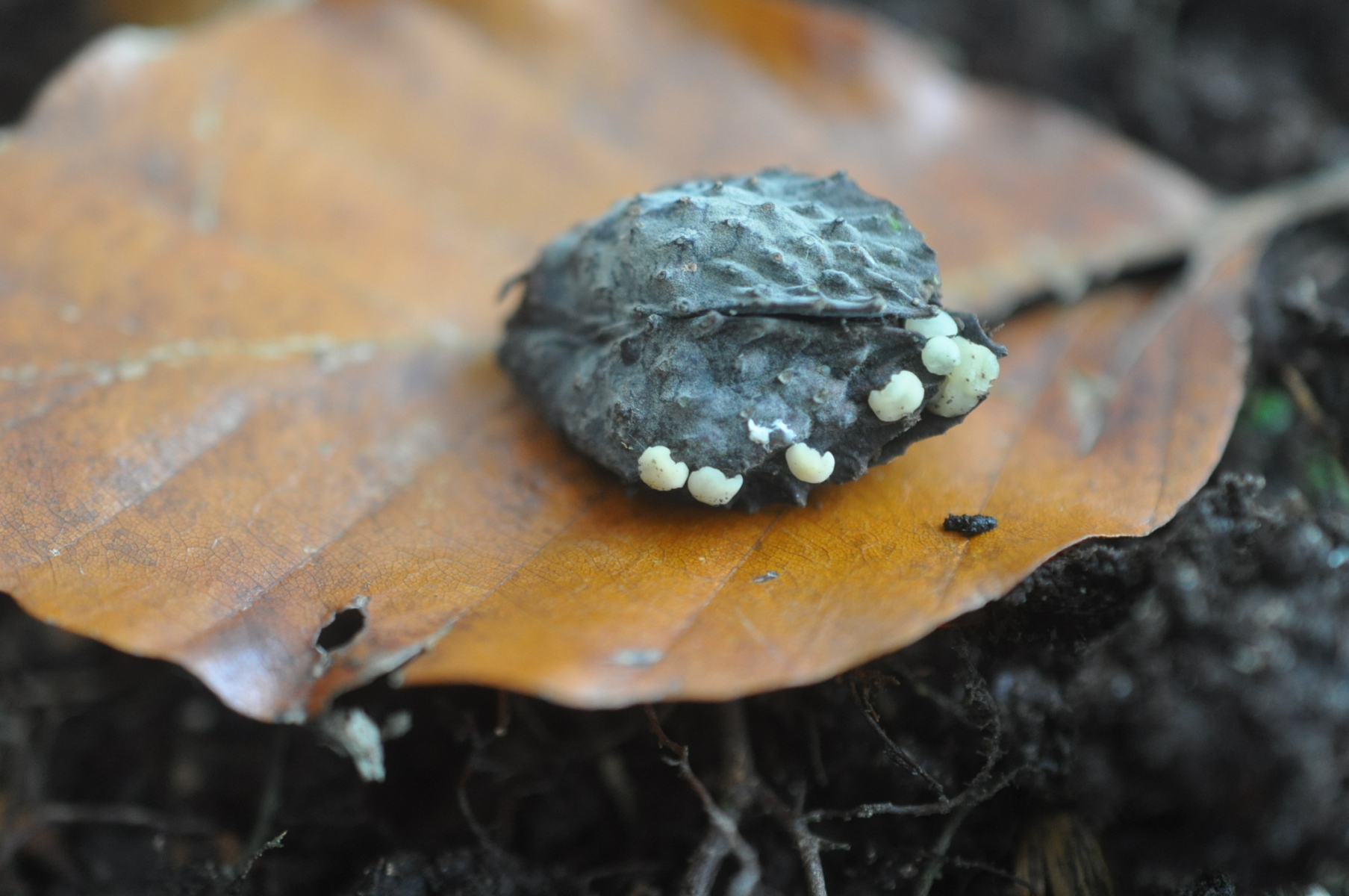 Und ein Interessantes , kleine weiße Becherlinge an Fruchthülle wahrscheinlich von Buche (schwierig zu Fotografieren)