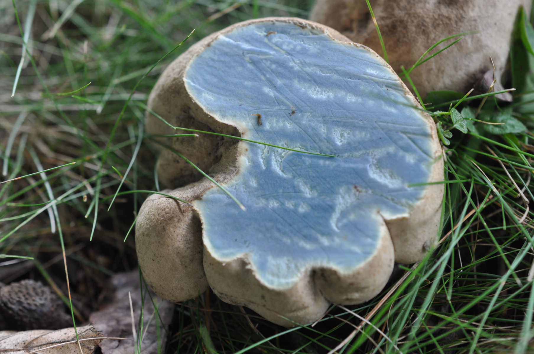 Die Blaue Farbe ist keine echte Farbe von Pilz . Du hast viele Flockies gefunden (Bild 1 , in Hintergrund) . Bei Flockies Schnitten deine Finger haben Blaue Flockies Farbe erhalten und du bist mit Finger diese Blaufarbe an Anhängselröhrling übertragen .