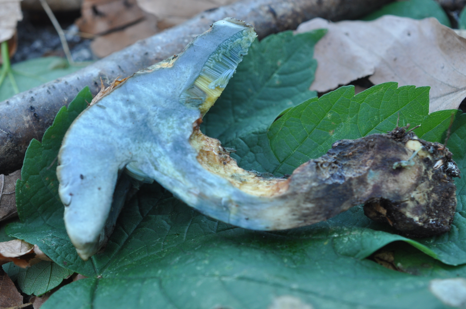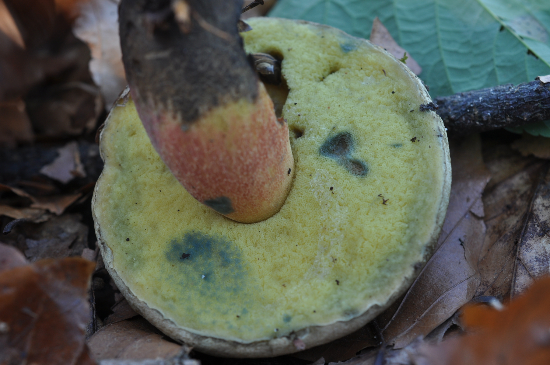 Geruch angenehm - Geschmack mild . Röhrenboden Gelb . Röhren - Fleisch stark Blauend . Bäume zuerst nur Buche und nach 20 m junge Fichte . Pilz ist wegen Dunkelheit nicht an Standort Fotografiert .