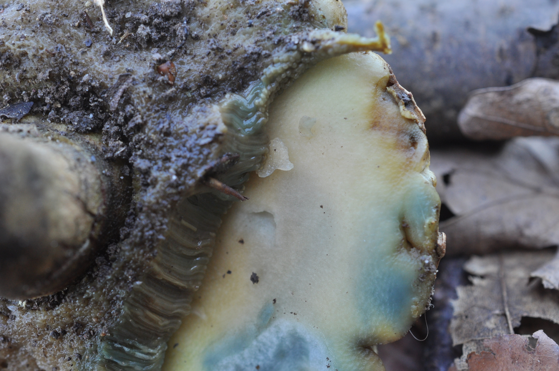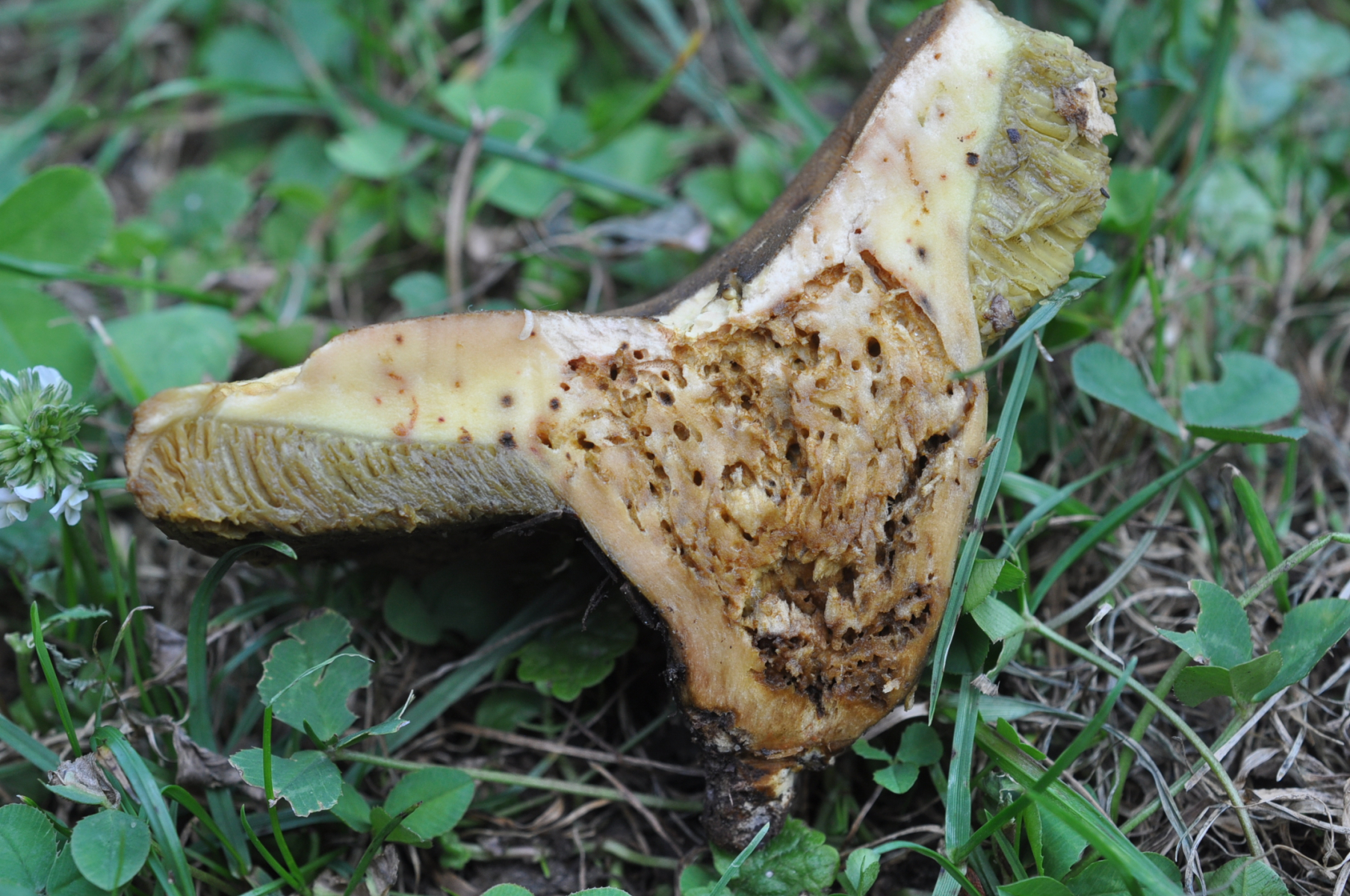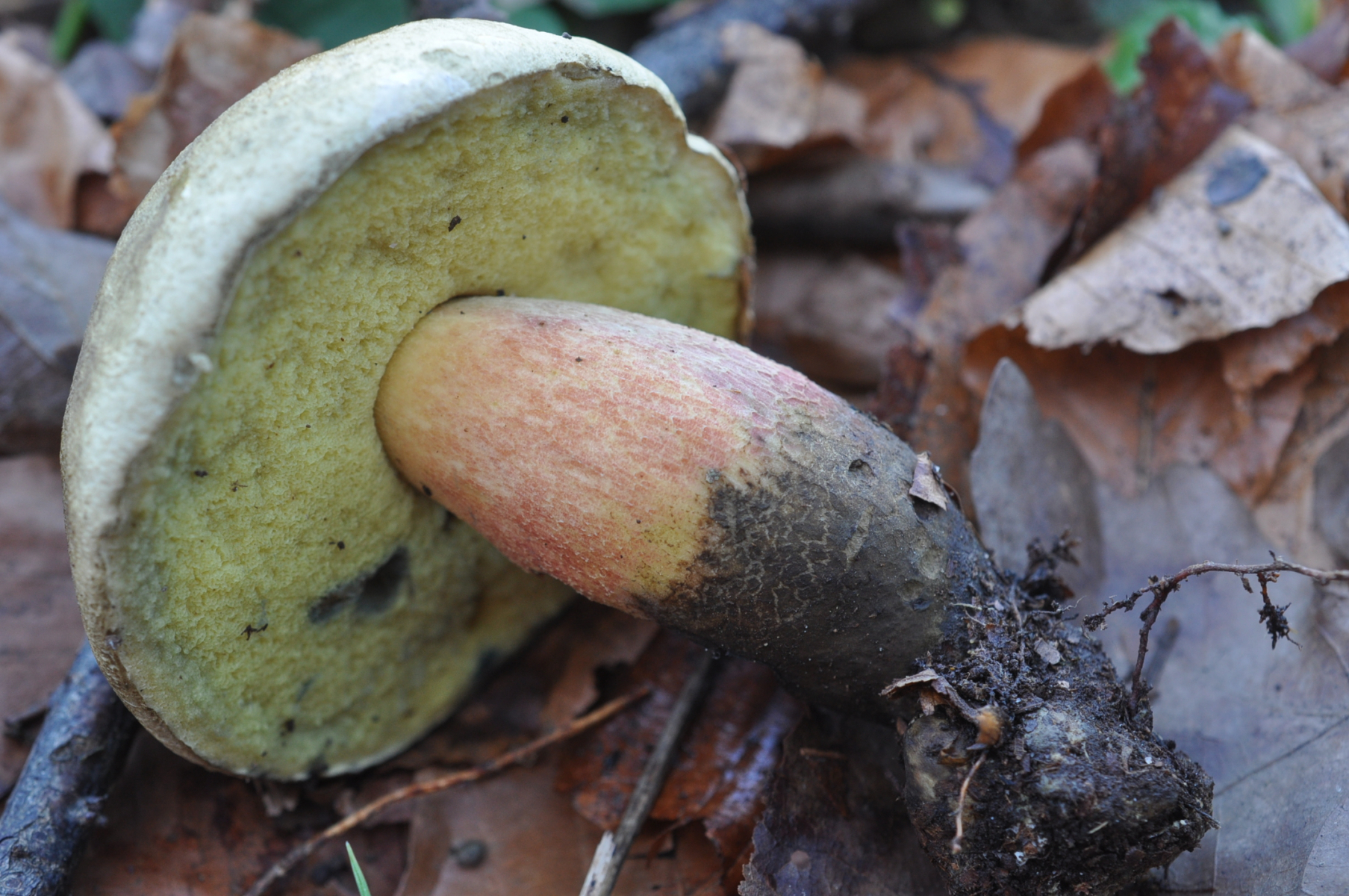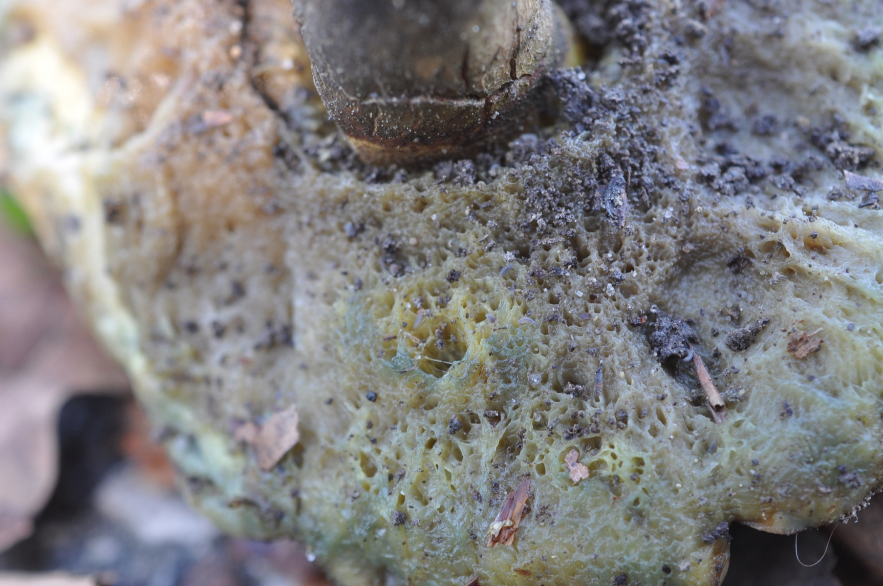 Bei diese Röhrling bin ziemlich siecher das um ungewöhnliche Caloboletus calopus gehet . Hut wie bei Gallenröhrling , Stiel wie bei Flockenstielige Hexen . Nach sehr lange kauen ich habe schwach bittere Geschmack gefunden . Frage ? Welche Röhrenboden Farbe hat C. calopus ? Ich kann nirgendwo finden .