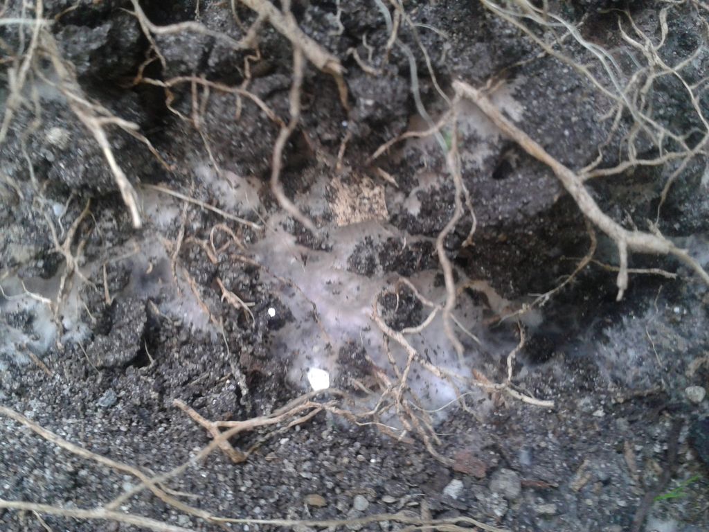 Mein Vermieter hatte sich letztes Jahr eine Pilzkiste mit Braunkappen-Myzel bestellt. Der Erfolg allerdings blieb auf ganzen Linie aus und so hatte er die gesamte Kiste in den Garten geschüttet. Die Ecke in der er sie "entsorgt", wird eigentlich dafür genutzt um Rasenschnitt und andere, anfallende Gartenabschnitte zu verwerten (Kein Kompost). Ich hatte dann bis heute dort Zucchini und Einlegegurken angebaut. Als ich heute die Pflanzen weggemacht habe, habe ich dort auf dem Boden ein weises Myzel entdeckt was mich sofort wieder an die Kiste vom vergangenen Jahr erinnerte.