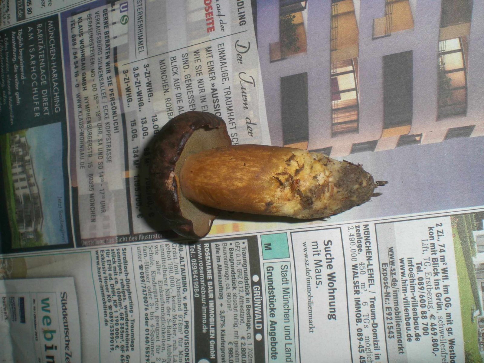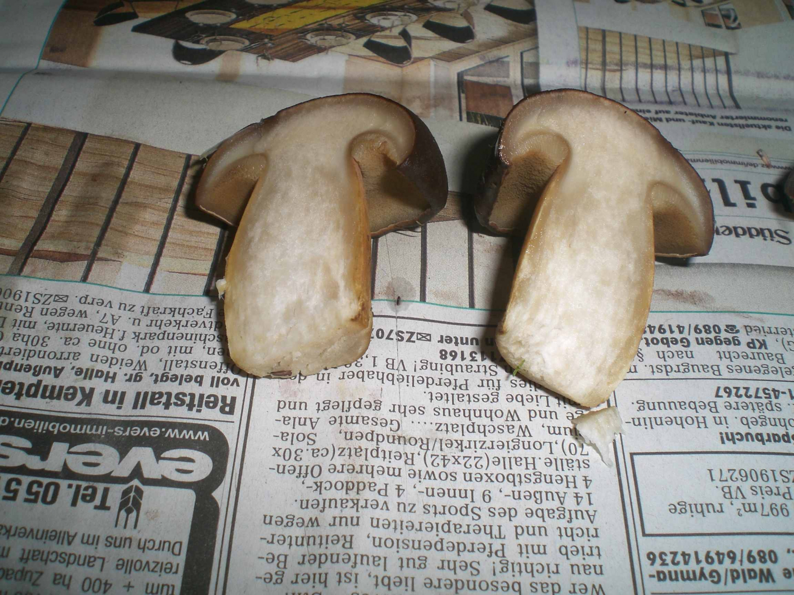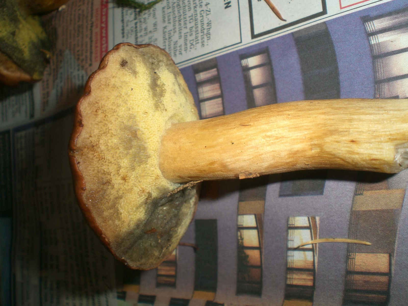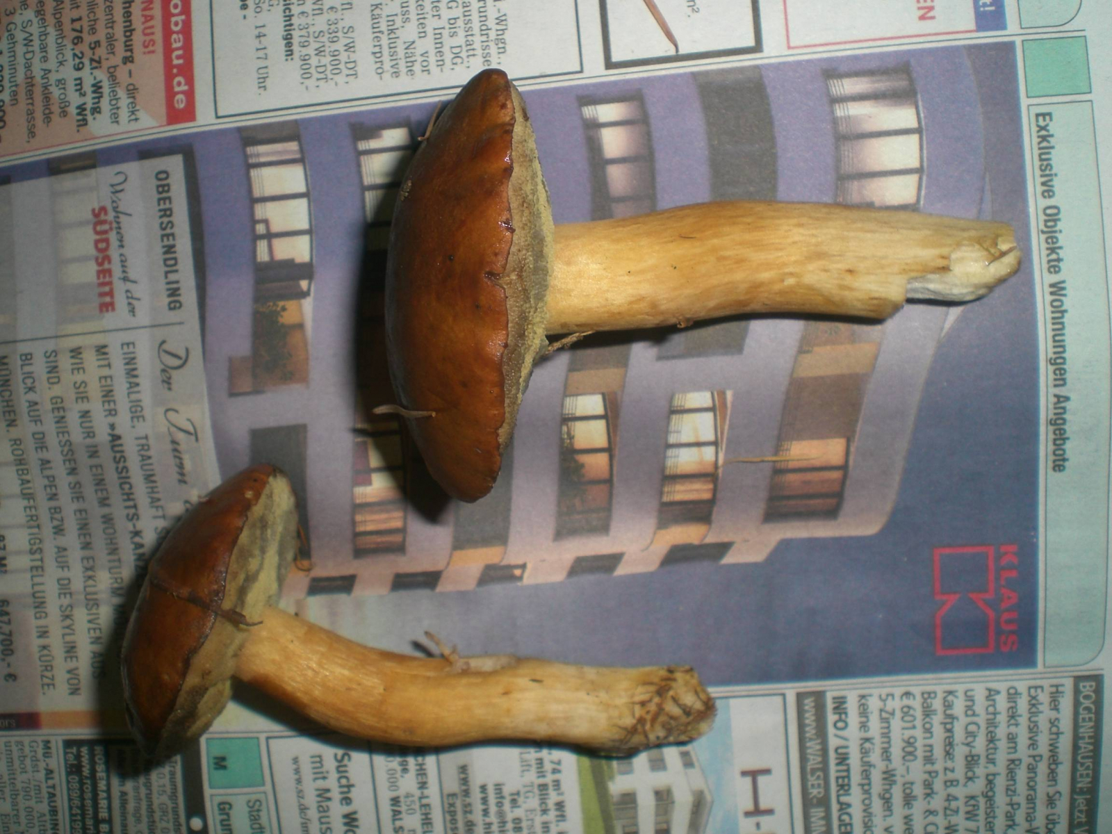Marone könnte zu dem 3. Pilz passen, es standen einige in der Nähe, bei denen Stiel- und Hutfarbe ähnlich waren. Nur die Form hat nicht richtig gepasst, der bauchige Stiel. Der Pilz ist auch schon in den Mülleimer gewandert, dass er so vergammelt ist hat man ihm von außen nicht so angesehen, er war nicht weich.