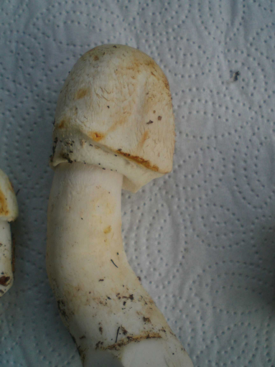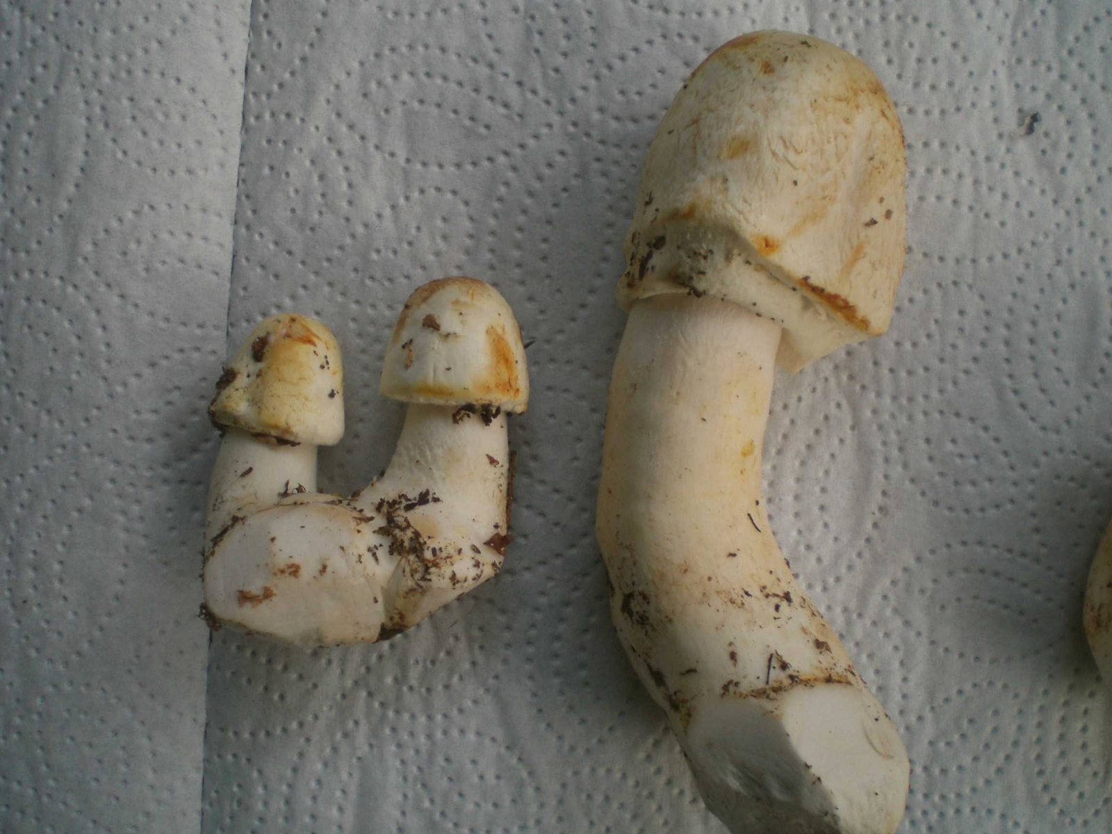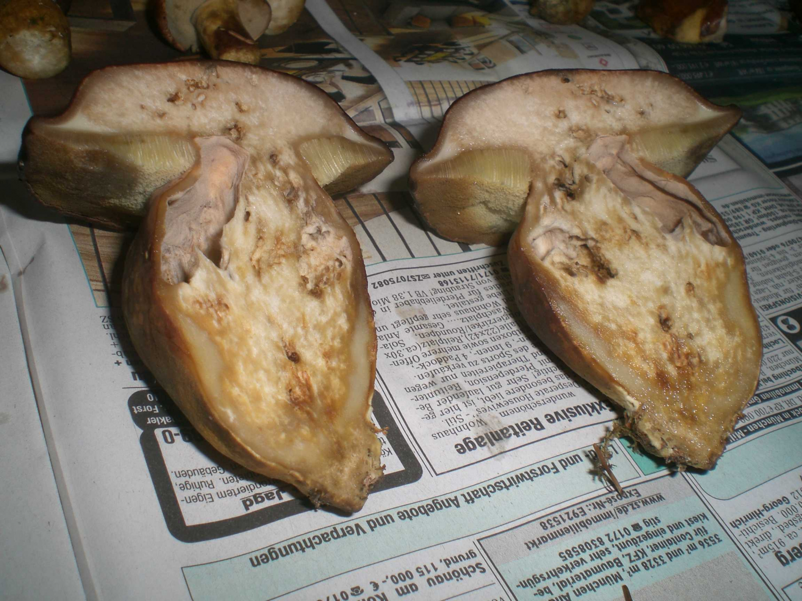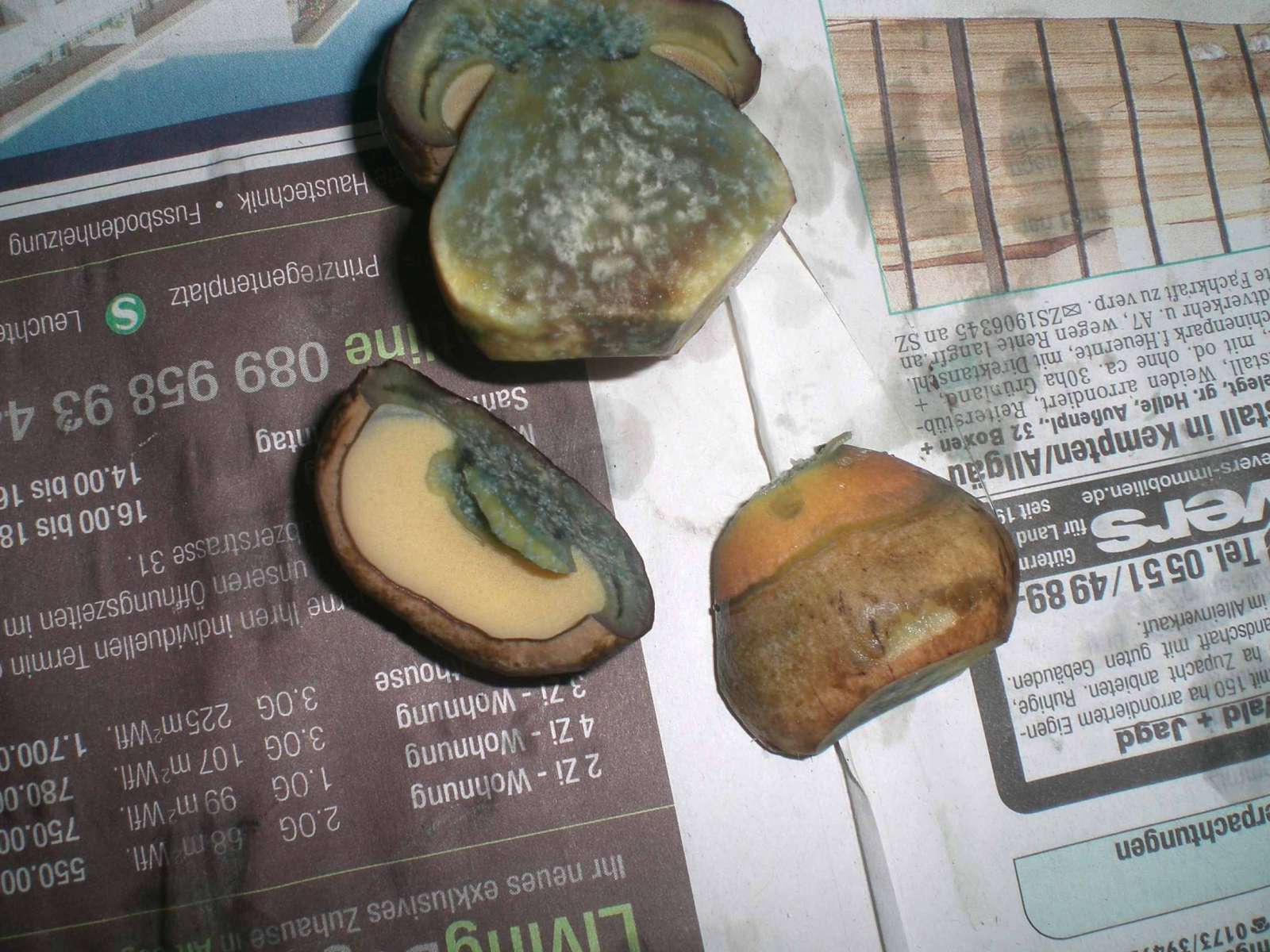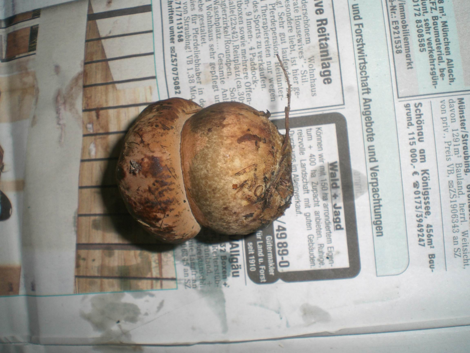 Marone könnte zu dem 3. Pilz passen, es standen einige in der Nähe, bei denen Stiel- und Hutfarbe ähnlich waren. Nur die Form hat nicht richtig gepasst, der bauchige Stiel. Der Pilz ist auch schon in den Mülleimer gewandert, dass er so vergammelt ist hat man ihm von außen nicht so angesehen, er war nicht weich.