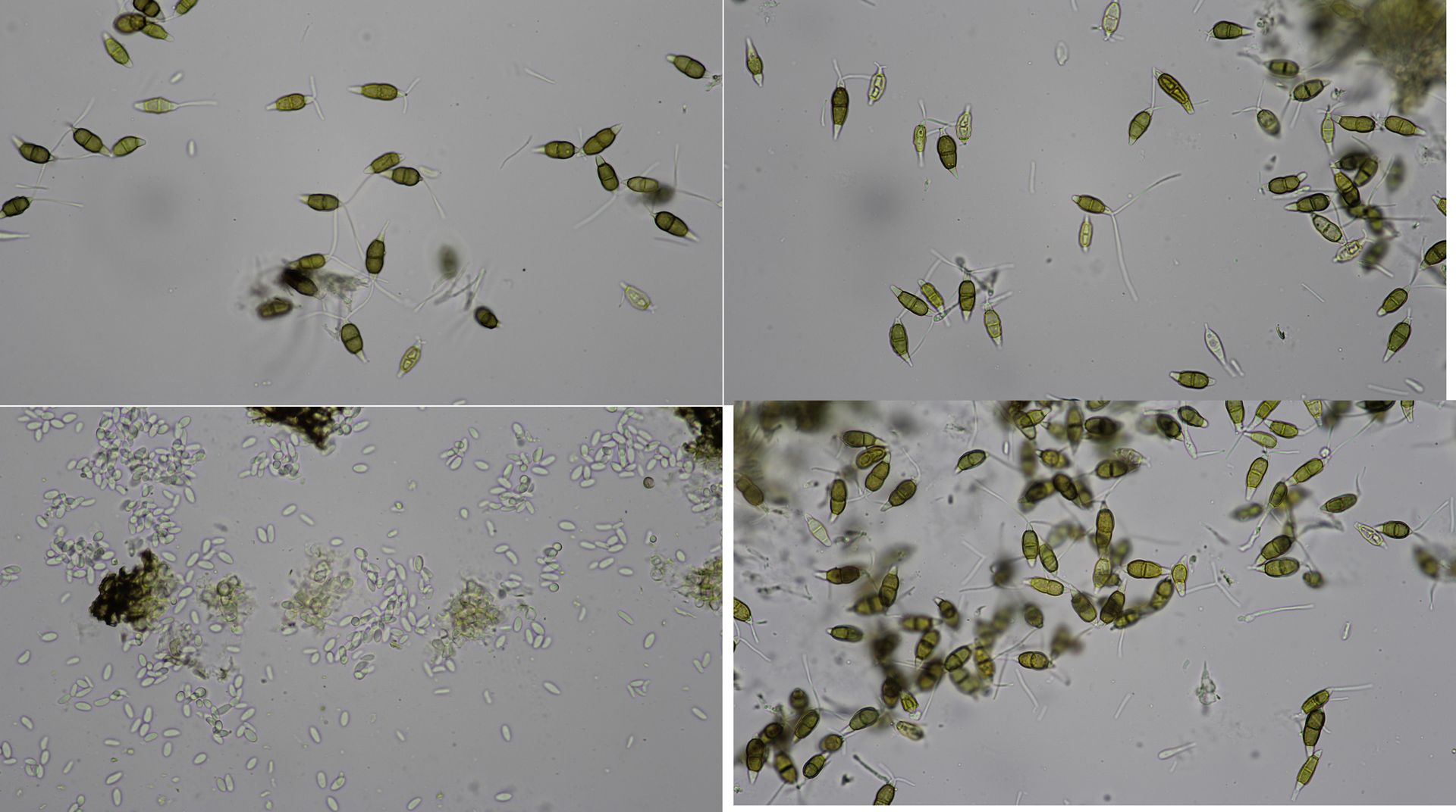 So sieht das Ganze aus, lustige Konidiensporen, links unten ist glaub ich was anderes, aber darum geht es nicht. Ich meine die braunen Sporen mit 3 Anhängseln... Maße lagen bei 14-17 x 7-8 µm.