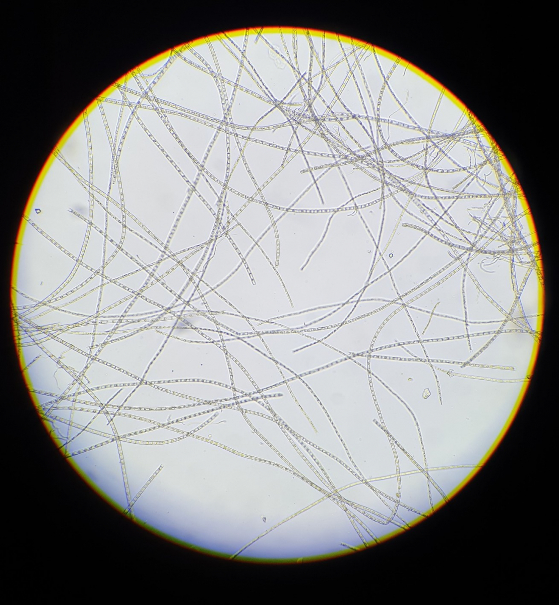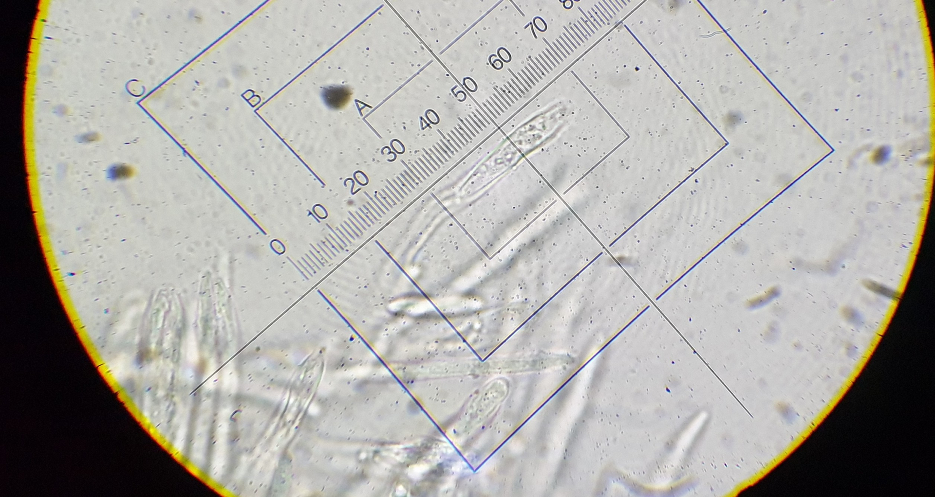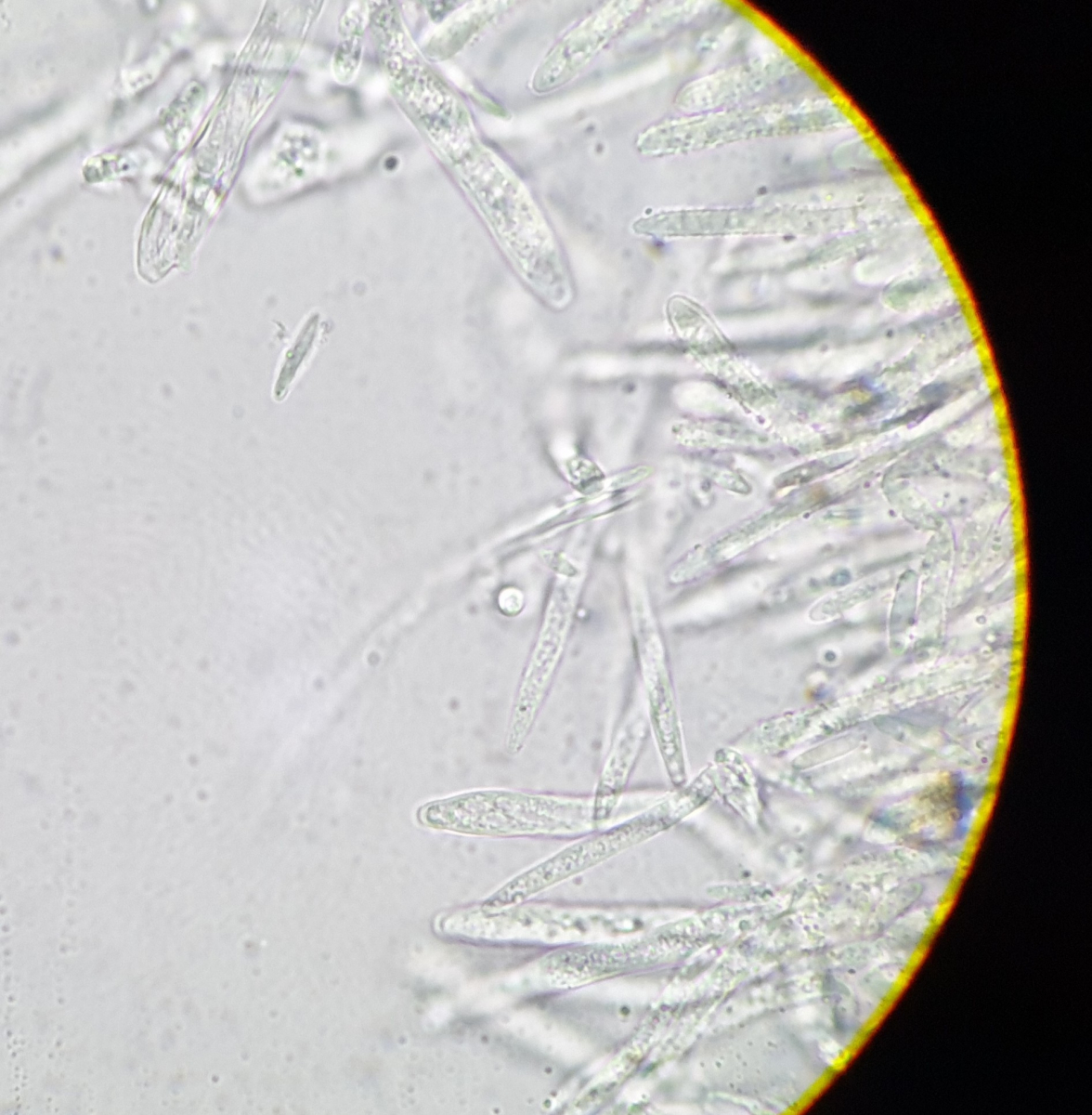 Leider konnte ich fast keine freien Sporen finden, so dass ich nur wenige Sporen messen konnte: ca 7 x 2 µm im Durchschnitt.