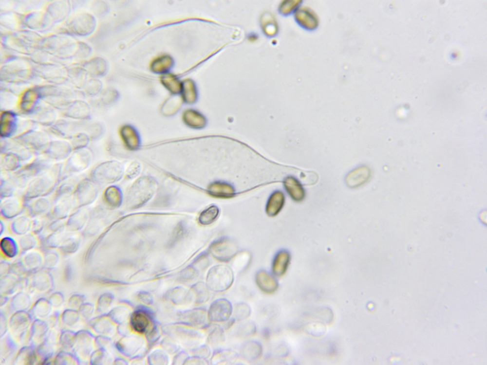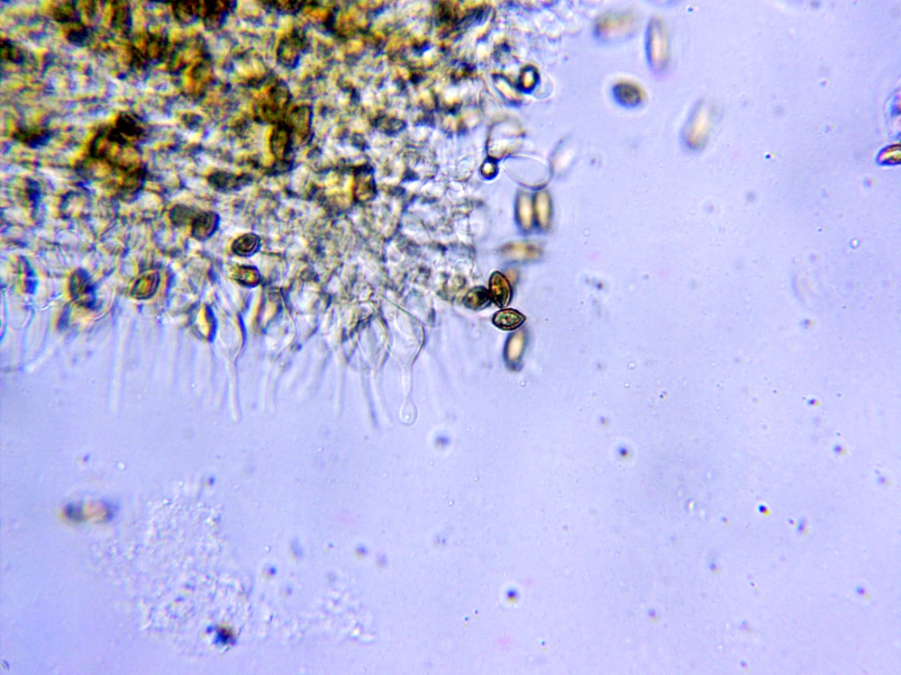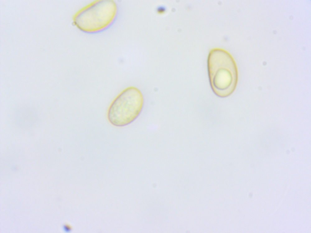 Die Sporen meines Fundes weisen keinen wahrnehmbaren Keimporus auf, was erst mal in Richtung P.aporos deutet. Allerdings weist mein Fund stark kopfige Cheilozystiden auf, was bei P.aporos nur schwächer ausgeprägt vorkommen soll.