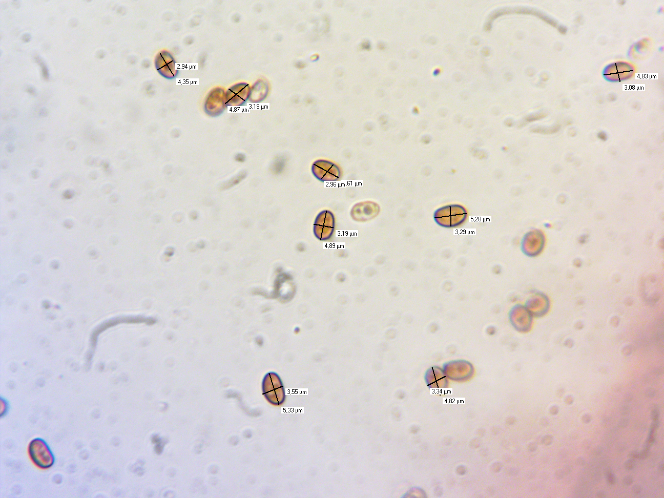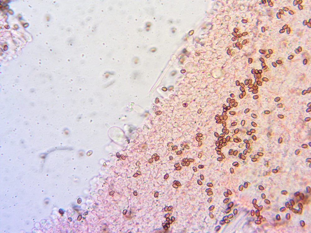 Mikroskopiert habe ich eine Scheibe aus dem Stiel. Ich hatte den Stiel so abgeschnitten das etwa noch 2mm aus dem Hut hervorragten und dann die Scheibe vom abgeschnittenen Stiel herunterseziert.