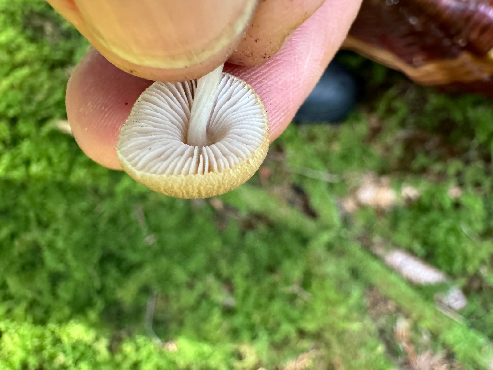 Lamellen frei, Hut grau mit leichtem Gelbstich, haarig, ca. 2 cm, Stiel glatt, weiß, längsfaserig. Geruch nicht unangenehm.