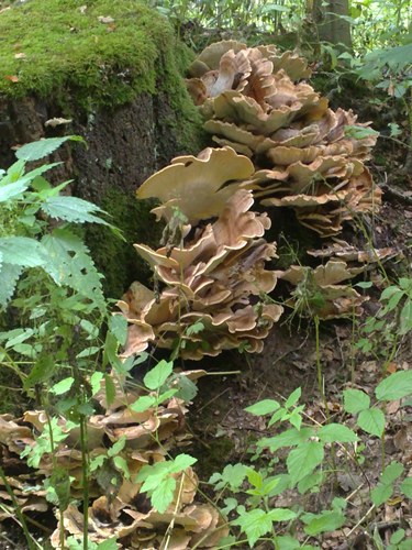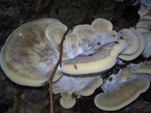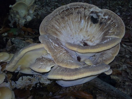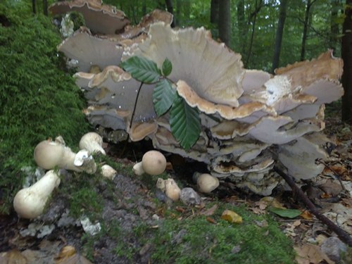 der ganze Wald war voll mit riesigen Porlingen. Eigentlich sahen sie aus wie Schwefelporling,waren aber statt gelb und orange eher beige bis graubraun/bräunlich. Sind das Riesenporlinge?Das Bild gibt das gewaltige ausmaß des Aggregats nicht wieder