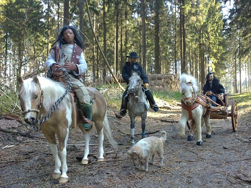 Er parkte dann die Kutsche am Waldweg und ritt im unwegsameren Gelände einfach auf ihr weiter