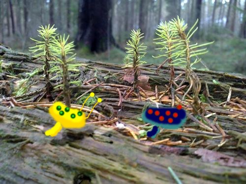 (ich fisch mal Kuschels Beitrag rüber, dann stimmt die Reihenfolge der posts auch wieder- da ward Ihr wohl genau gleichzeitig)....eines zweiten Scheibchens.dieses war gelb mit grünen Punkten- wie war denn das mit in die Dose gekommen? es hüpfte sogleich hinter dem ersten her. das seltsamste: das gelbe hatte Antennen