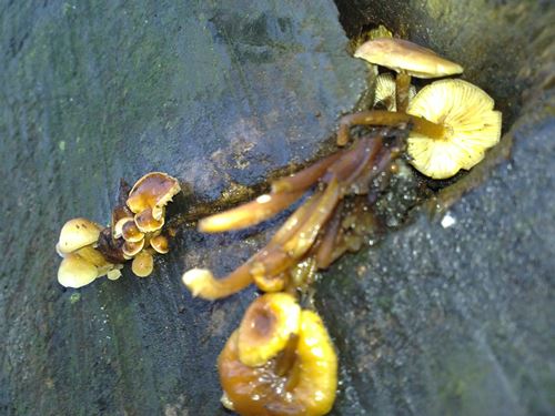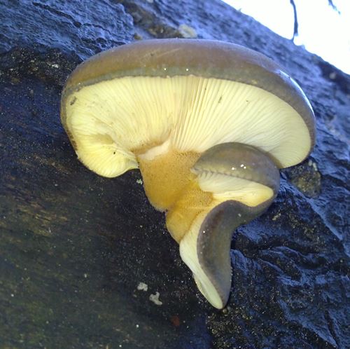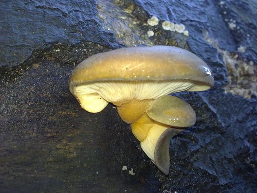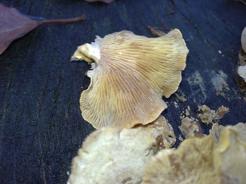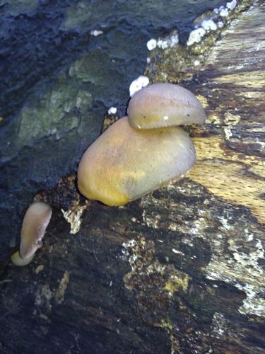 5. direkt daneben und somit im guten Vergleich,der gelbstielige Muschelseitling. neben des Gelbton sieht man doch ganz deutlich daß bei der Auster die Lamellen weiter runterlaufen, während sie hier am Stiel deutlich abgesetzt enden (irgendwie halte ich den an dem Lärchenholz neulich im anderen Thread doch auch eher für einen Muschelseitling nun, es gibt ja evt davon auch nioch nicht-gelbe?)