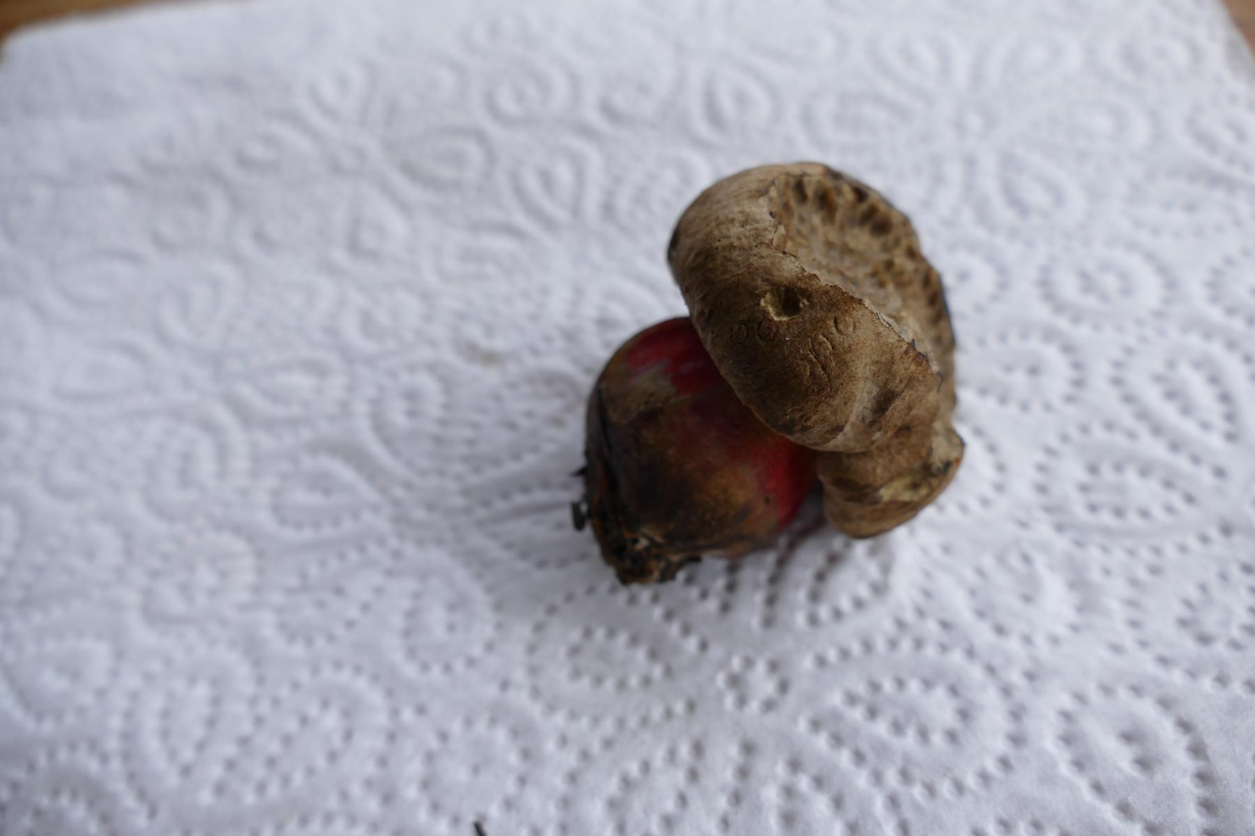 habe heute im Streifzug einige Pilzchen finden können und bin mir bei diesem jungen Exemplar nicht ganz sicher. Er wuchs zwischen einigen Netzstieligen Hexenröhrlingen allerdings ist mir der knollige Stiel zusammen mit der grellroten Farbe irgendwie komisch vorgekommen.