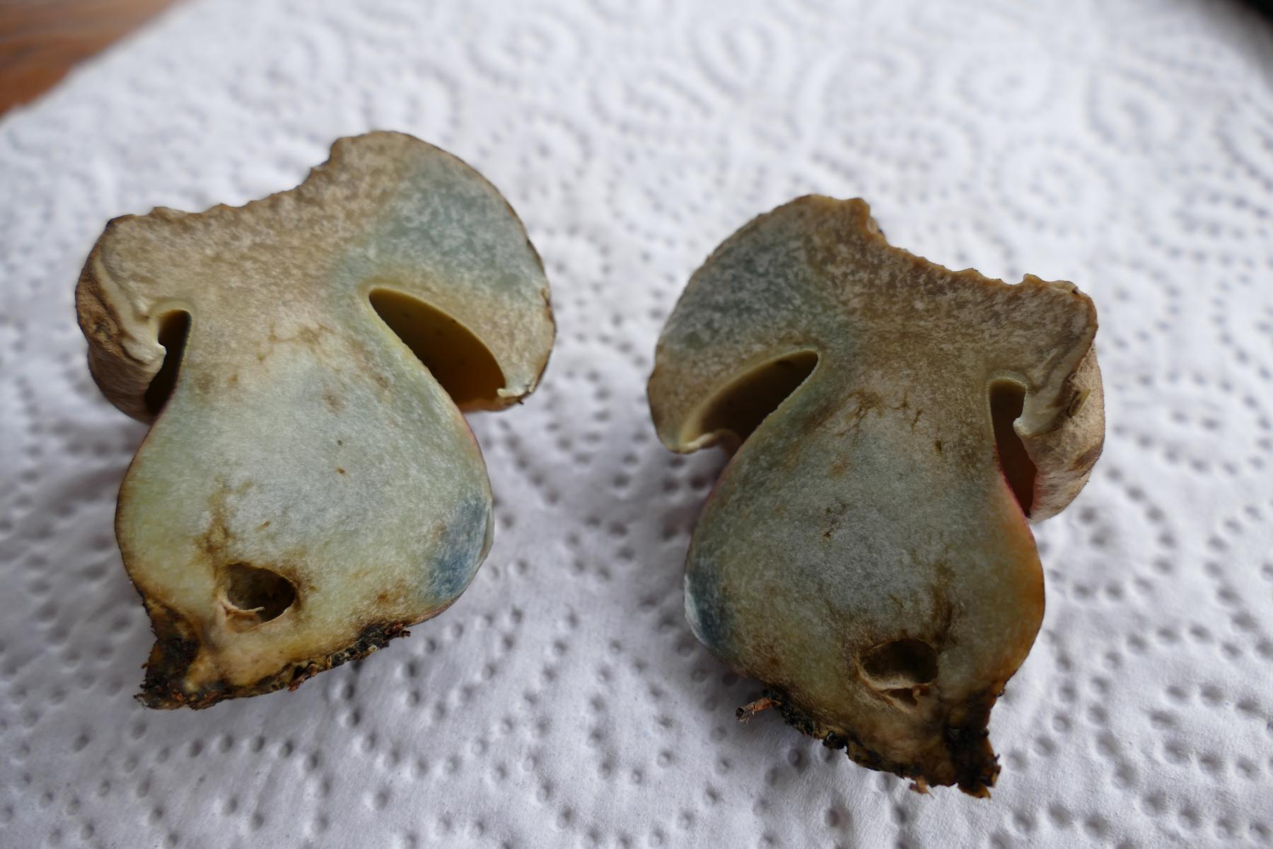 Im Anschnitt ist er nur leicht blauend. (1 Bild direkt nach Anschnitt, dass andere ca. 2 Minuten danach)