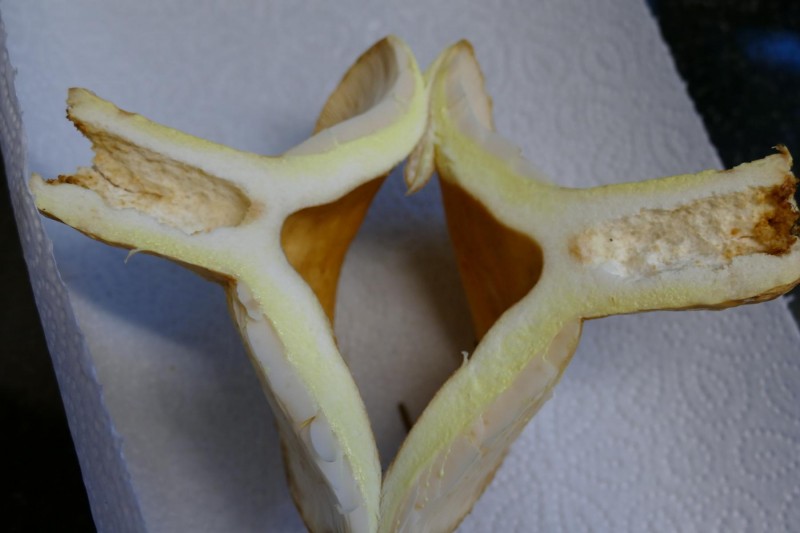Er ist gelb/gelblich hat einen relativ grossen Hut (10-15 cm) dafuer im Vergleich einen kurzen hohlen Stiel (5 cm). Beim Anschnitt kommt schöne gelbe Milch zum Vorschein. Die Stielbasis brach beim Herausnehmen ab. Geruch ist ebenfalls sehr angenehm pilzig. -