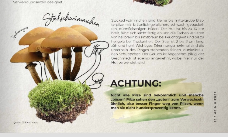 Hierzu fand ich vor 2 Wochen dies in einem Kundenmagazins einer grenznahen Supermarktkette in Südwestdeutschland. Neben 5 relativ einfach zu bestimmenden Speisepilzen auch das Stockschwämmchen.