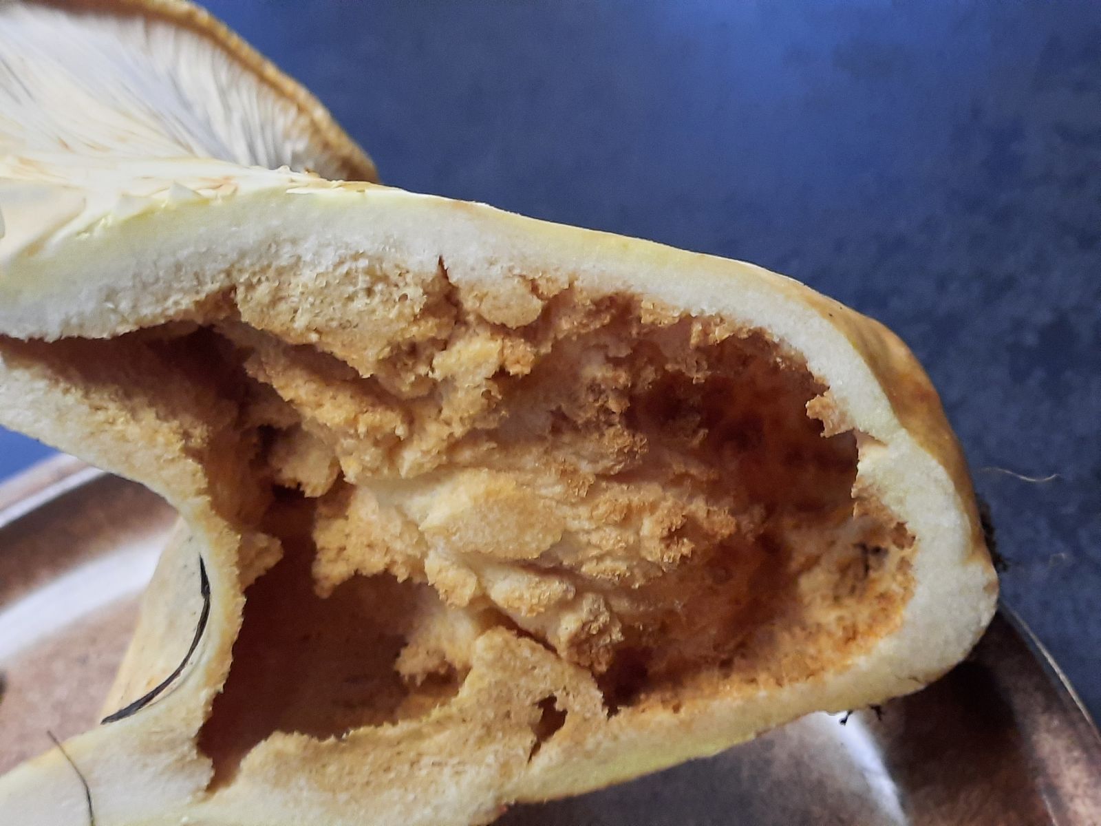 Stamm: ca. 15 mm Durchmesser, mittelbraun, unten die Oberfläche ein wenig wie Rinde. Nach leichterem Druck, splittert der Stamm längs, obwohl er sich beim Abschneiden des Pilzes recht stabil anfühlte.
