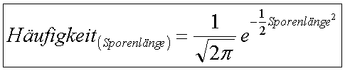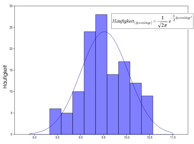 "Der Erwartungswert der Sporenlänge ist 9,52 µm und bei 68% der gemessenen Sporen wird die gemessene Länge innerhalb der Standardabweichung also innerhalb 9,52 µm ± 0,5172 µm also zwischen 9 und 10,03 µm liegen.