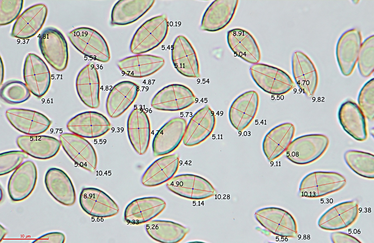 Es ist also nicht sehr sinnvoll, wenn man durch ein Messokular mal hier, mal da eine Spore misst und dann versucht, damit einen aussagekräftigen Vergleich mit Literaturwerten zu machen.