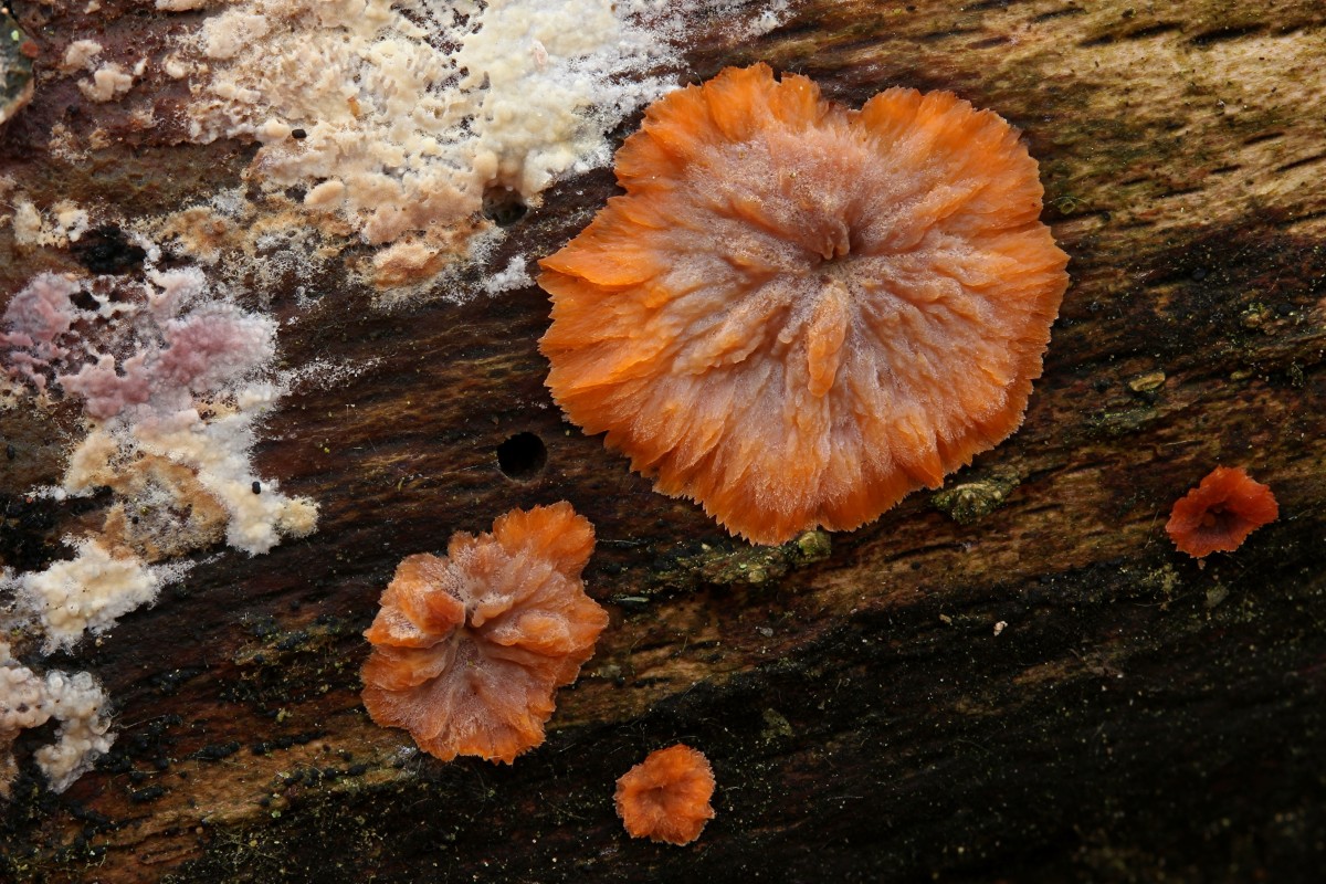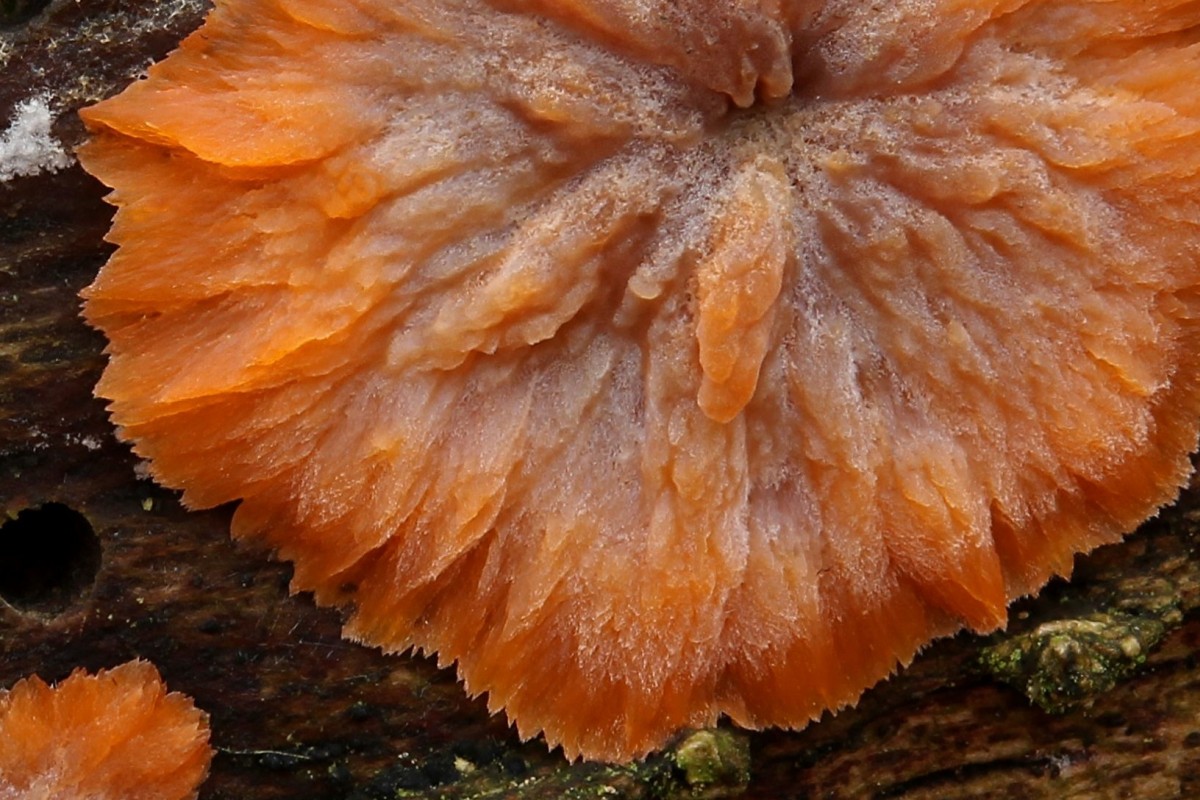 Der Orangerote Kammpilz (Phlebia radiata):