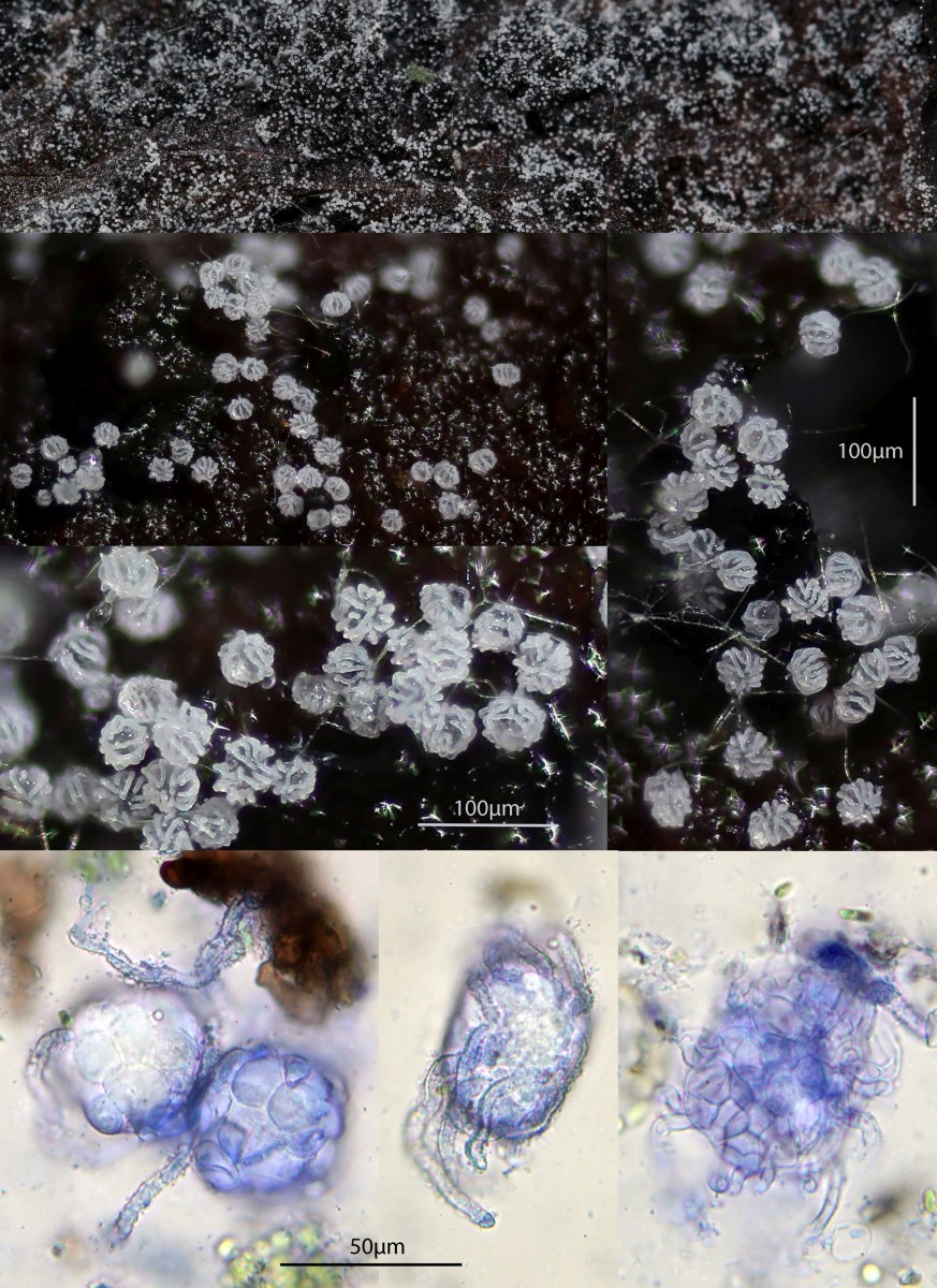 Makroskopisch nur als im Gegenlicht schimmernder Hauch auf Holz erkennbar. Die Art konnte ich lange Zeit nicht bestimmen, bis ich mir "The Genera Of Hyphomycetes" zugelegt habe. Damit ließ sich die Art dieser monotypischen Gattung leicht herausfinden. Im Netz sind dazu nur Infos zu finden, wenn man den Namen schon kennt. Mit Sicherheit einer der kleinsten und spannendsten Pilze, die ich je zu Gesicht bekommen habe.