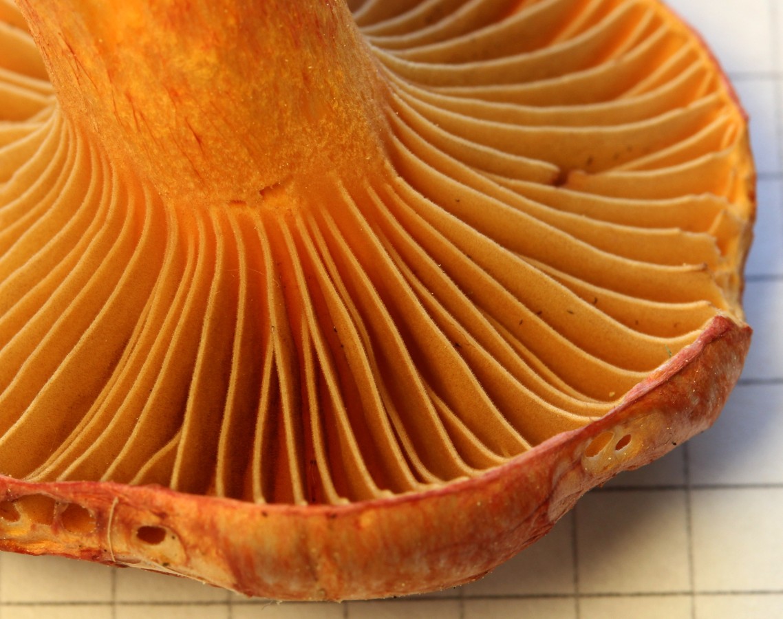 orange, mit Zwischenlamellen, ohne Y-Gabeln, leicht ausgebuchtet angewachsen