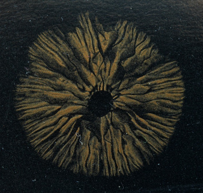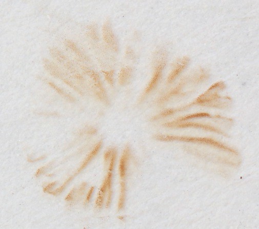 dunkelbraun, nach außen hin heller wedend, feucht glatt, beim trocknen deutlich weiß befeift