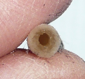 weiß, glänzend, kein Ring, keine Ringzone, kein Gürtel, oben mit Schuppen, innen eine Röhre, in der Röhre ist ein transparenter bis gelblicher Saft.