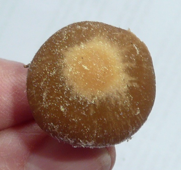 karamellbraun, Zentrum heller, mit weißen Fasern, glatt, nicht bereift, hygrophan