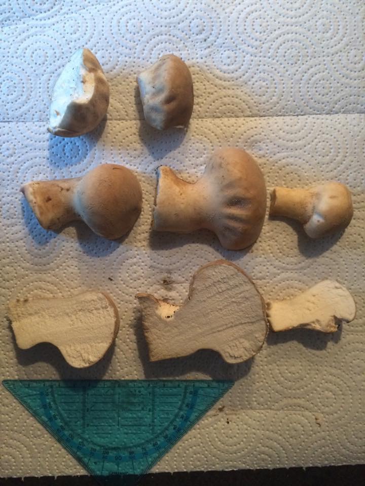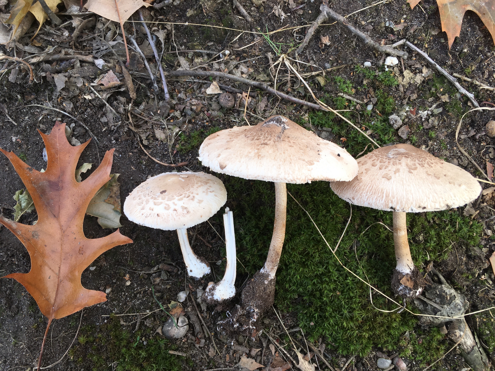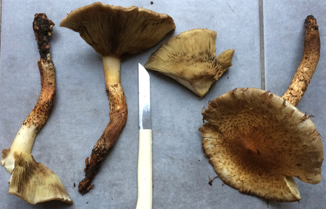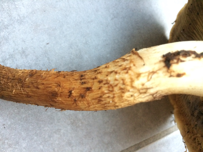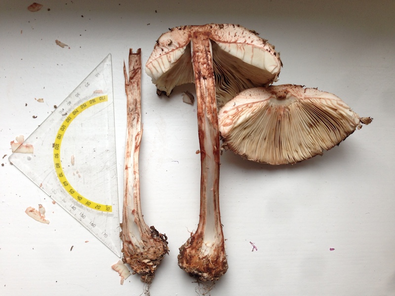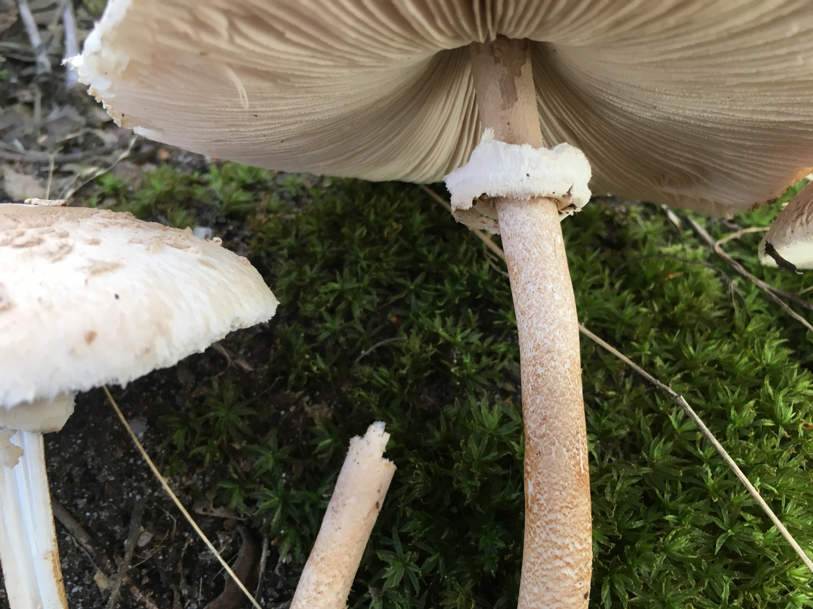 Ich tippe auf den Safranschirmling, da er keinen genatterten Stil hat. Er sieht eher faserig aus. Schneidet man ihn an, so läuft er zügig braun, leicht rötlich an. Riechen tut er ganz gut - wobei ich mit meiner Nase nicht gut bin - er riecht für mich "irgendwie ganz lecker nach Pilz". Einige haben einen Ring, einige nicht. Der Ring lässt sich nicht verschieben. Alle Pilze standen innerhalb von 1,5 Quadratmeter beieinander. Keiner der Pilze ist ganz ausgeklappt.