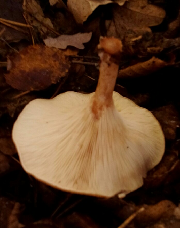 Der Stiel ist gummiartig, ließ sich nicht brechen, die Farbe der Lamellen geht ins gelbliche, sie sind nicht bis zum Stiel wachsend. Den Geruch konnte ich schnupfenbedingt nicht testen.Vielen Dank, Grüße