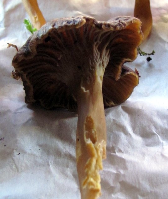 Seine Lamellen und das Fruchtfleisch sind reinweiß. Abgetrennt habe ich ihn nicht da er das einzige Exemplar war.