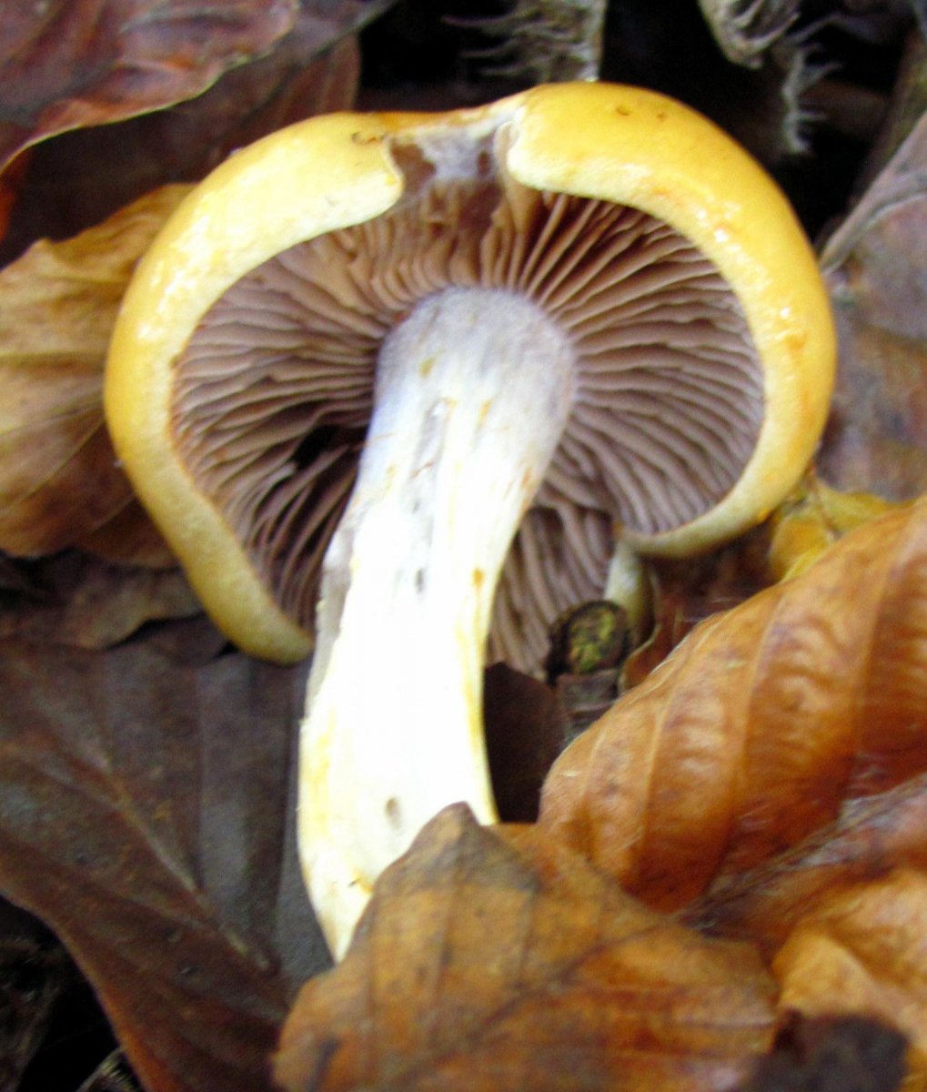 Seine Lamellen und das Fruchtfleisch sind weiß. Das Fruchtfleisch ist nicht so kompakt wie bei dem Pilz mit der gelben Hutoberseite, eher schwammig.