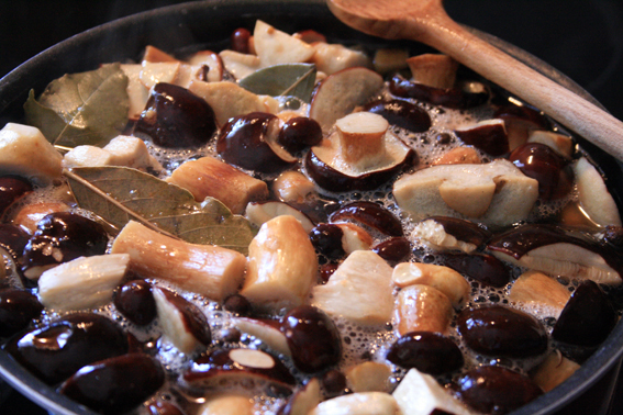 Die Pilze (am besten junge Maronen, junge) Steinpilze sehr gut von Schmutz und schlechten Stellen befreien, am besten im Stück oder große Pilze grob zerkleinert in den Sud geben.