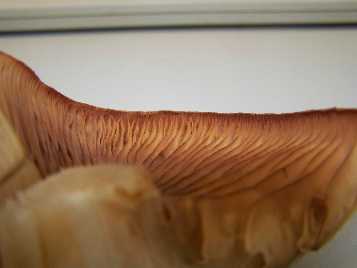- Beschreibung Fruchtschicht: bränliche Lamellen, die scheinbar fast bis zum Stiel reichen. Auf den Bildern sieht man den Lamellenansatz, Zwischenlamellen und dass sie sich am Hutrand stark verzweigen.