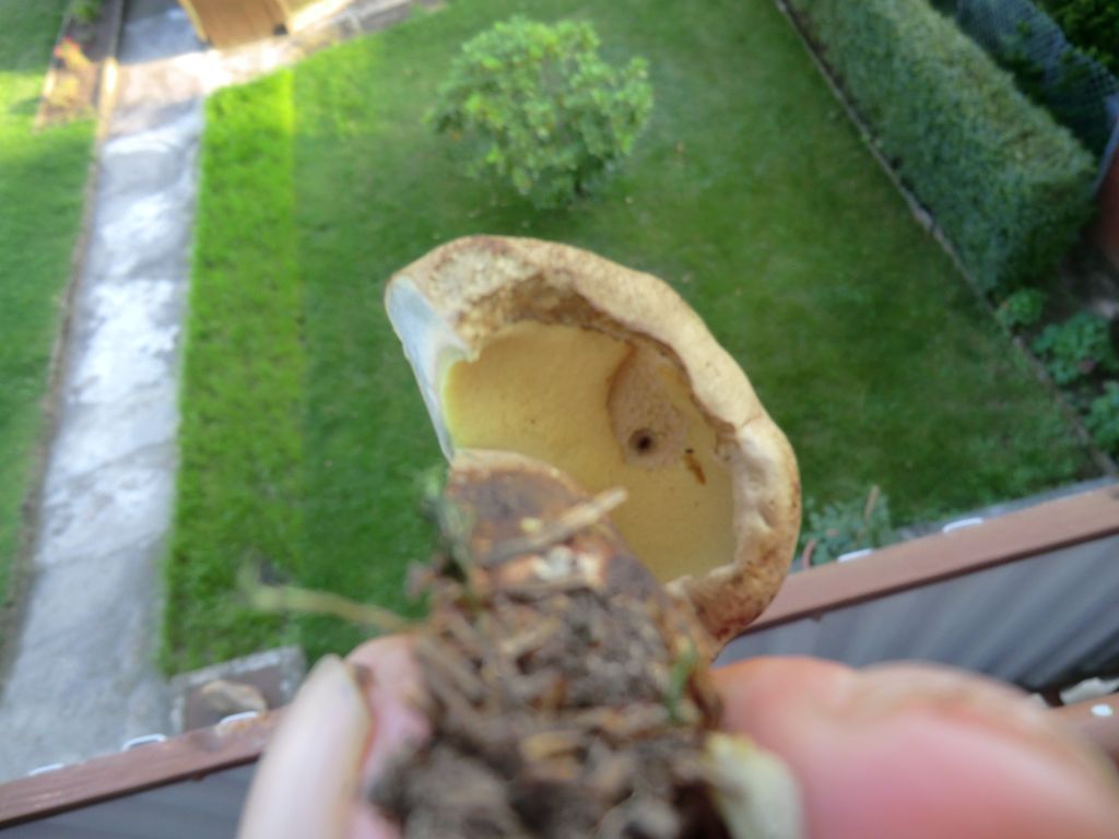 Gesehen hatte ich auch noch einen Röhrling, allerdings war er schon fast zersetzt bzw. zerfressen. Von der Huthaut war nur noch wenig zu erkennen, sie war hellbraun und von den Röhren, diese waren schon dunkelbraun ( weil der Pilz schon am vergehen war! ) , nur noch ein Stück von 1X1cm übrig, aber die Röhren waren recht groß. Ich hatte den Pilz, zumindest den Rest aufgeschnitten und der Geruch war ekelhaft faulig, was aber wohl eher am Zerfall des Pilzes lag!