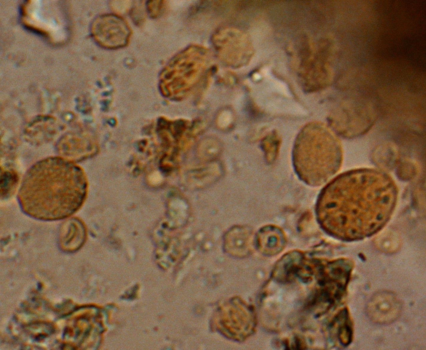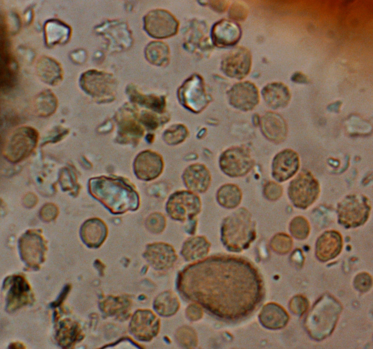 Ich habe keine Konidienträger, nichts an anderen Strukturen. Sie sind in großer Zahl in einer Probe getrockneter Morchelstücke zu finden - möglicherweise stammen sie aus anhaftenden Erdteilchen trotz industrieller Reinigung der Probe?