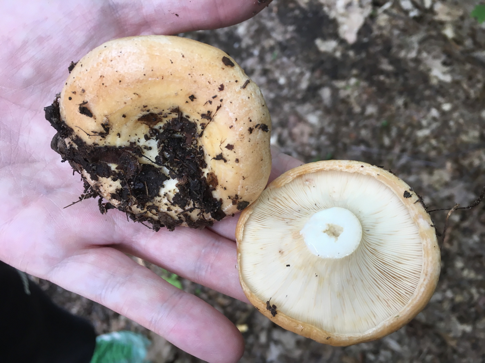 Bei diesem Milchling dachte ich wegen der Grübchen zunächst an einen Reizker, doch beim Anschneiden zeigte sich eine weißliche, sehr scharfe Milch.