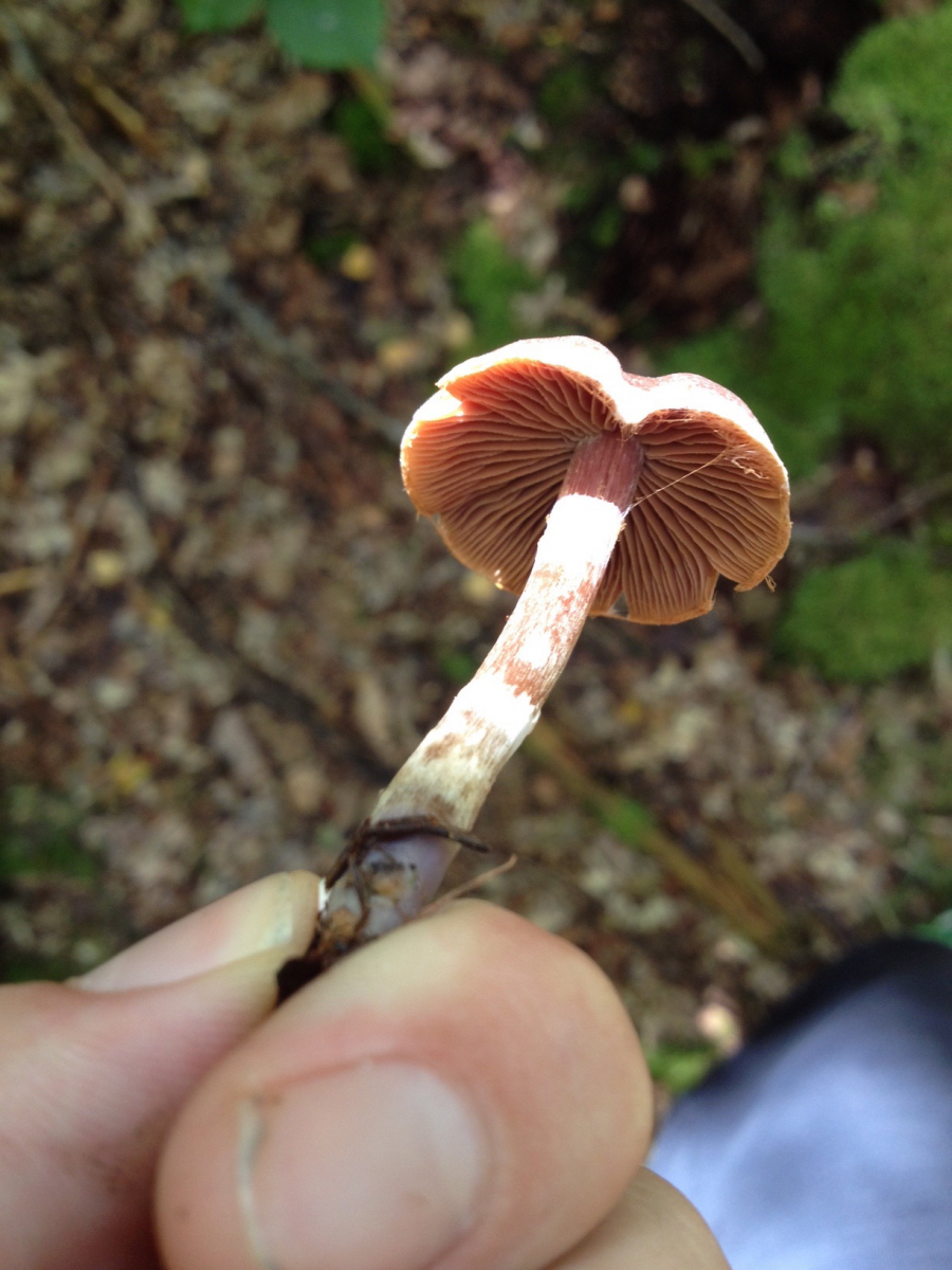 Stiel: wie nennt man das richtig? genattert? oder wars bereift?Die Schleierreste zwischen Hut und Stiel lassen mich auf die Gattung Cortinarius tippen, weiter bin ich aber nicht gekommen.