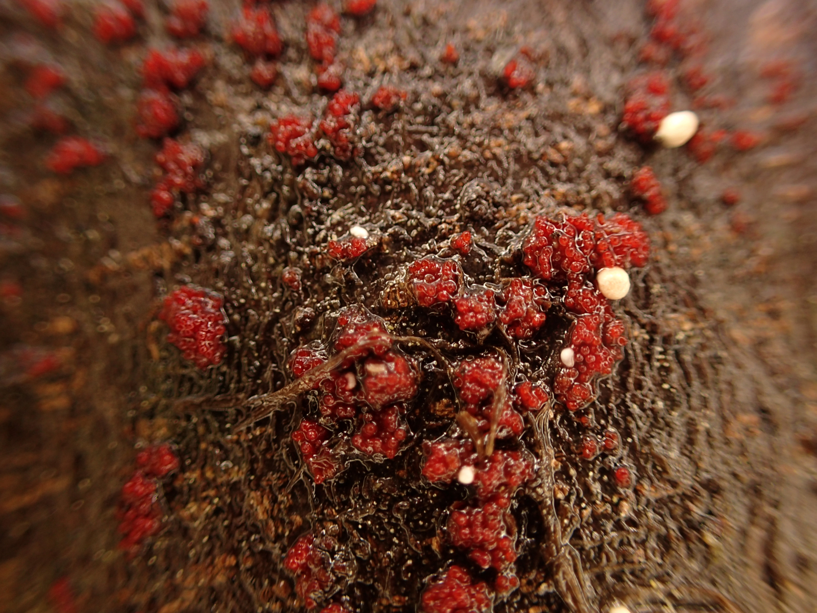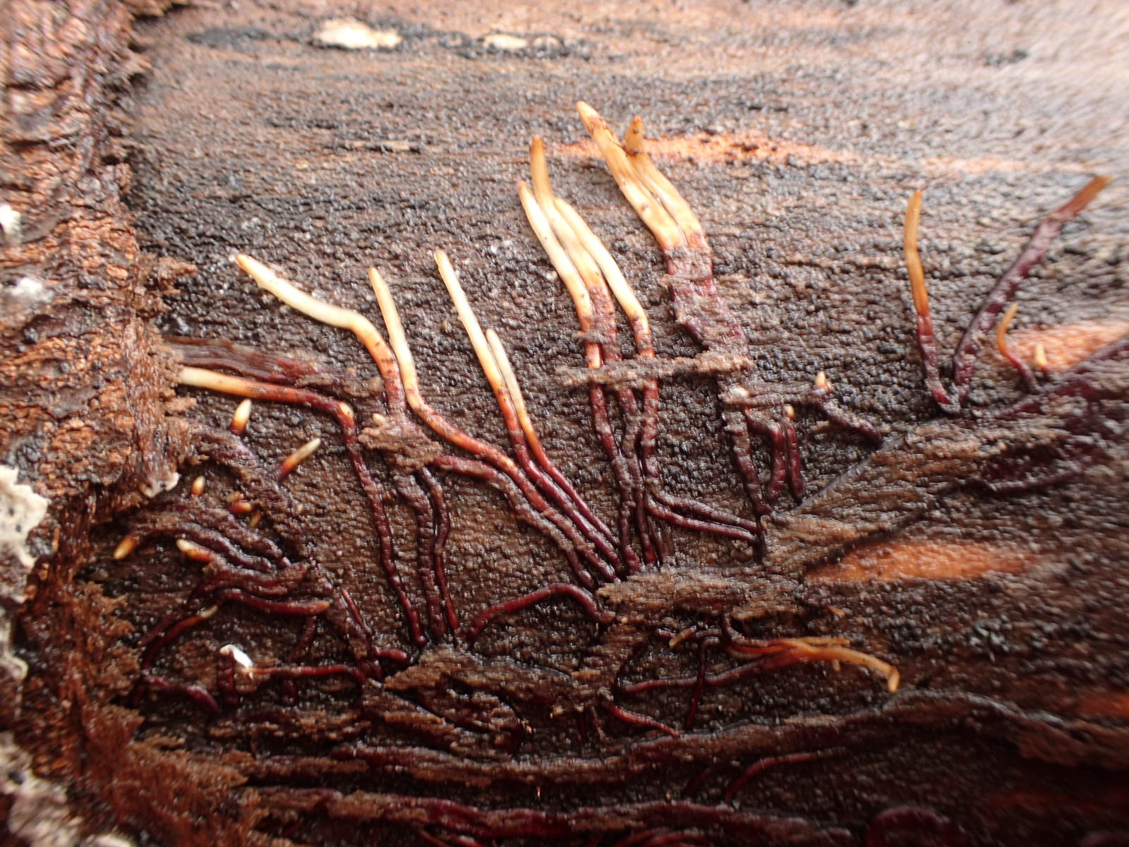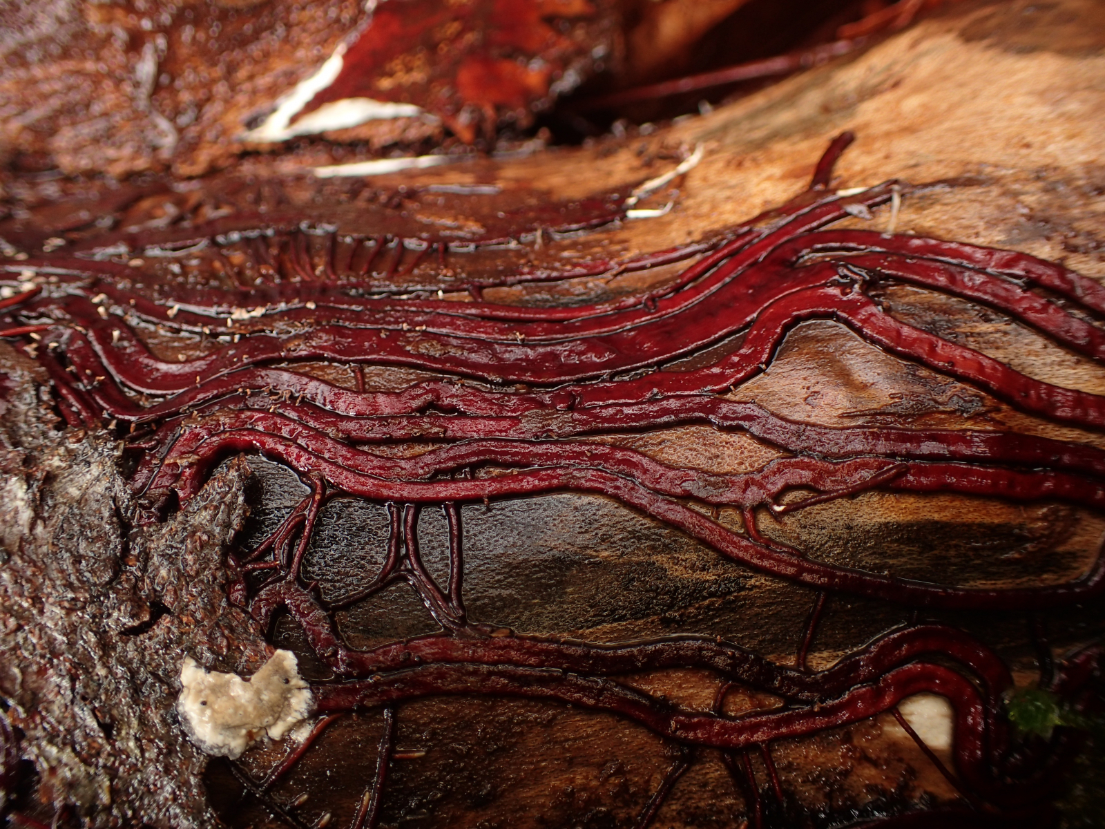 In einem Buchenwald fand ich an einigen liegenden Buchenstämmen mit Nectria coccinea unter der Rinde leuchtend rote Rhizomorphen, wie ich sie sonst nur tiefschwarz von Hallimasch kenne. Auffällig war immer das gemeinsame Auftreten mit Nectria coccinea. Was kann das sein?