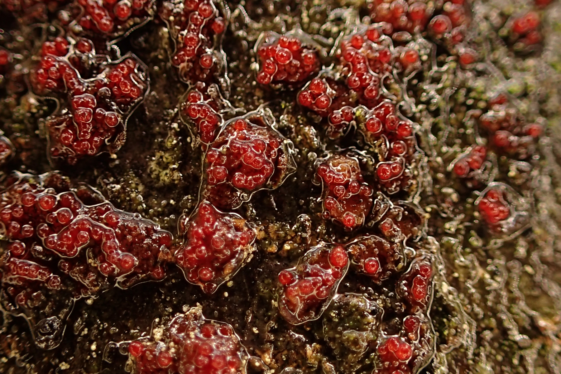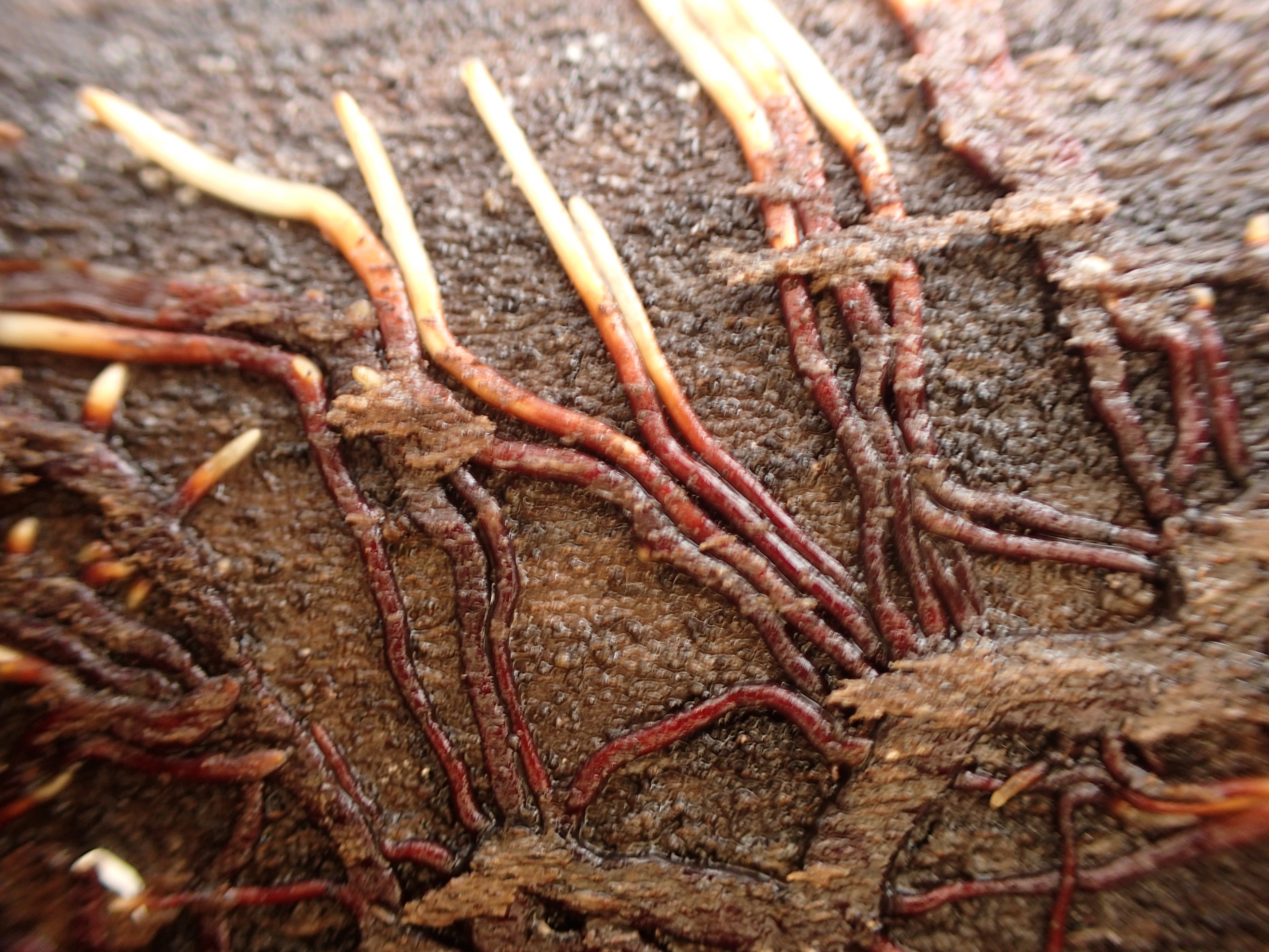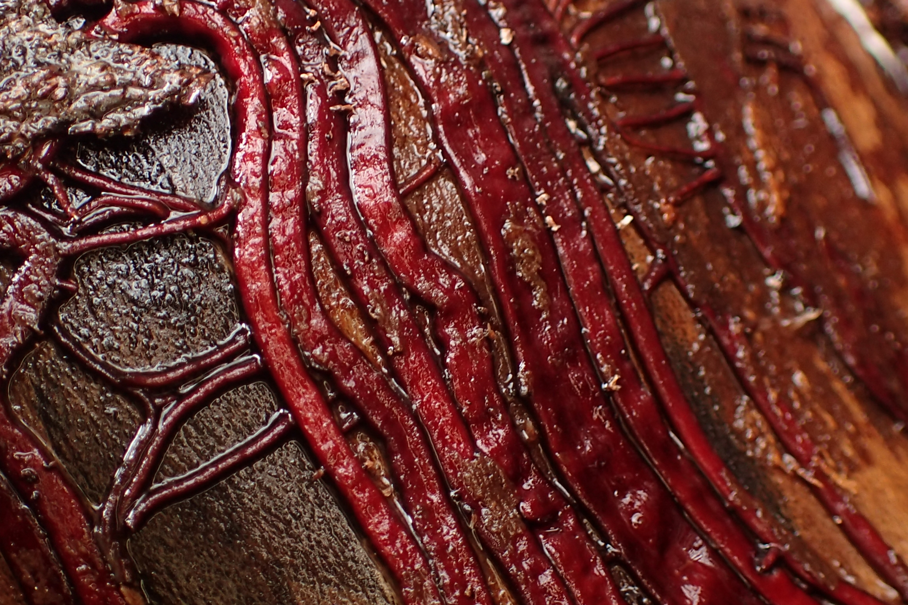 In einem Buchenwald fand ich an einigen liegenden Buchenstämmen mit Nectria coccinea unter der Rinde leuchtend rote Rhizomorphen, wie ich sie sonst nur tiefschwarz von Hallimasch kenne. Auffällig war immer das gemeinsame Auftreten mit Nectria coccinea. Was kann das sein?
