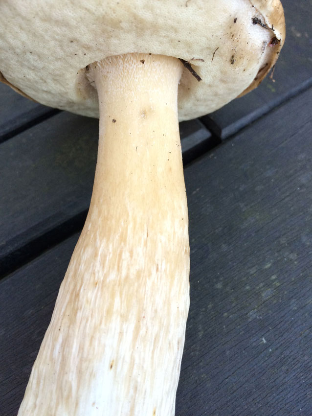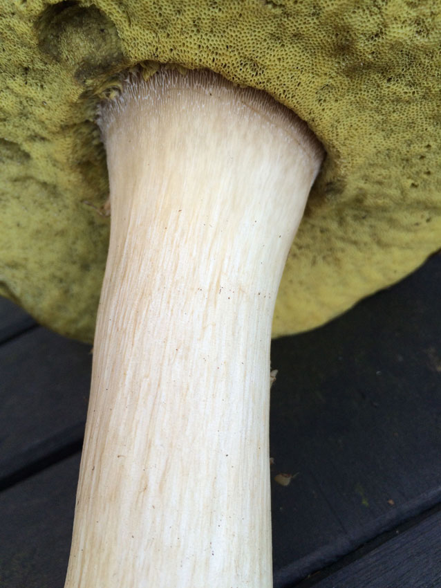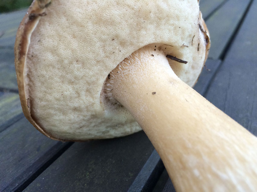Was mich eben stutzig gemacht hat, ist die Ausbuchtung der Röhren am Stiel. Die anderen Steinpilze hier in der Gegend gehen gerade weg vom Stiel...;-)