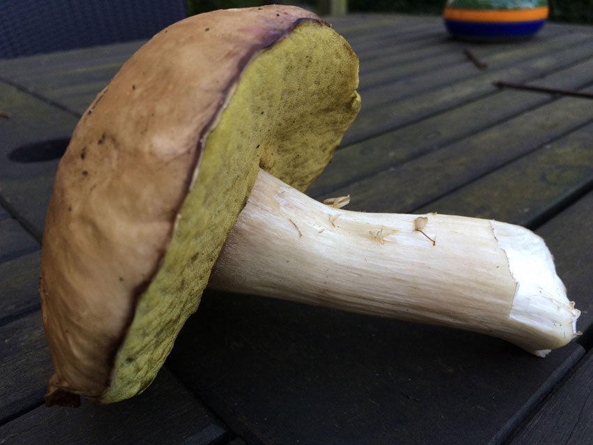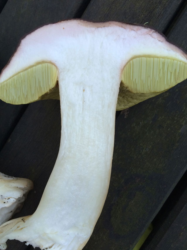 Hut wie Sommersteinpilz, sehr trocken und fest. Auffallend gelbe Röhren, viel gröber als beim Steinpilz. Auch eher gar nicht bläuend, am Hutrand eher minimalistisch rötlich verfärbend. Stiel auch auffallend glatt. Ziegenlippe...?Beide Pilze haben am Übergang Stiel-Röhren eine Ausbuchtung.