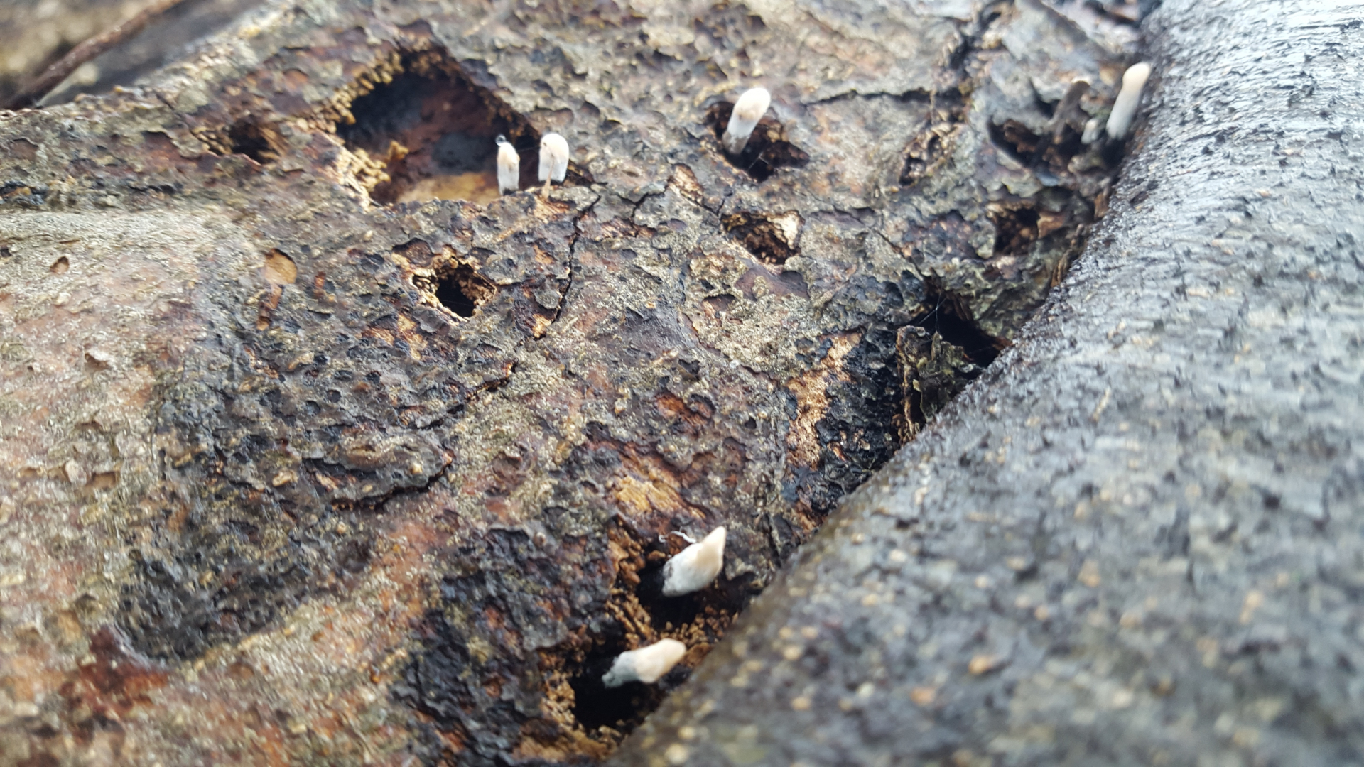 Hier meine Bestimmungsanfrage. Ich vermute eine Holzkeule auf (wiedermal) Buche. Fk ist ca.7mm hoch und 3mm breit. Da Weiß über Schwarz, wohl eine Anamorphe. Danke für Eure Hilfe.