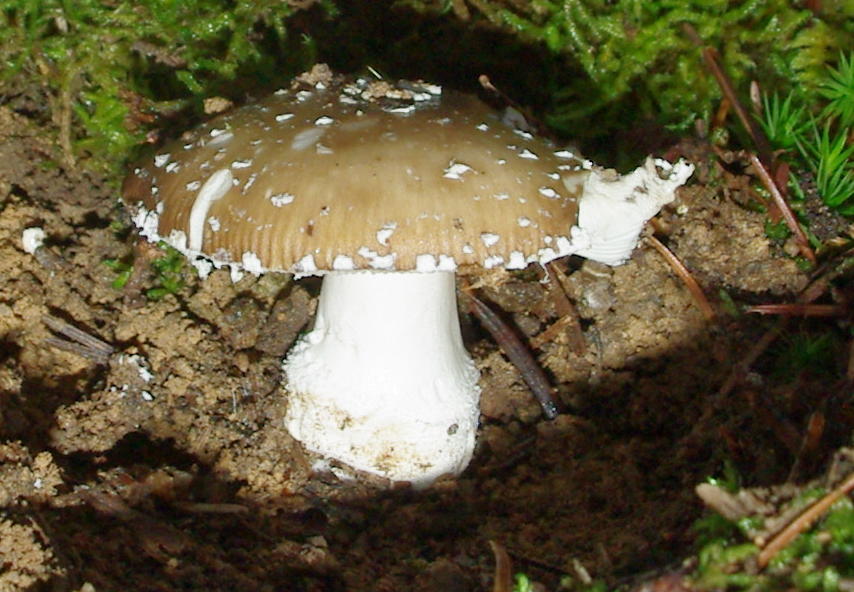 Ich tippe ja schon noch auf den Pantherpilz, kann ihn aber nicht sicher gegen eine Grauen Wulstling (dagegen spräche die Riefung am Pilzrand, dafür spräche die ich so deutlich abgesetzte Knolle) oder einen Isabellbfarbenen Wulstling (dafür spräche der fehlende Ring, dagegen die doch braune und nicht lachsfarbene Hutfarbe).