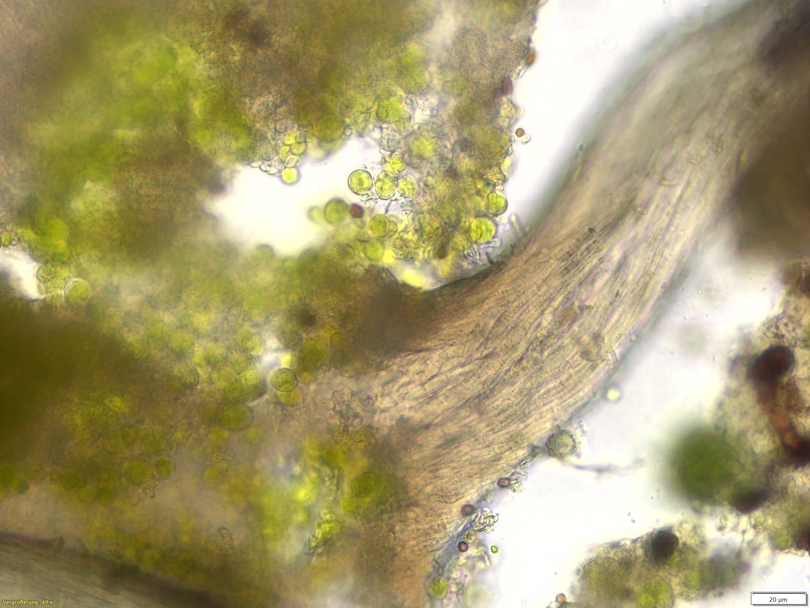für mich immer noch Flechte. Ich muss sagen, ich bin kein Flechtenfachmann und kenne auch die zugehörigen Mikros nicht, aber vielleicht bekommst du dich anhand meines Beispiels (was natürlich nicht stimmen muss, aber ich dachte zumindest an etwas in diesem Bereich in jung) in die richtige Richtung gehangelt..