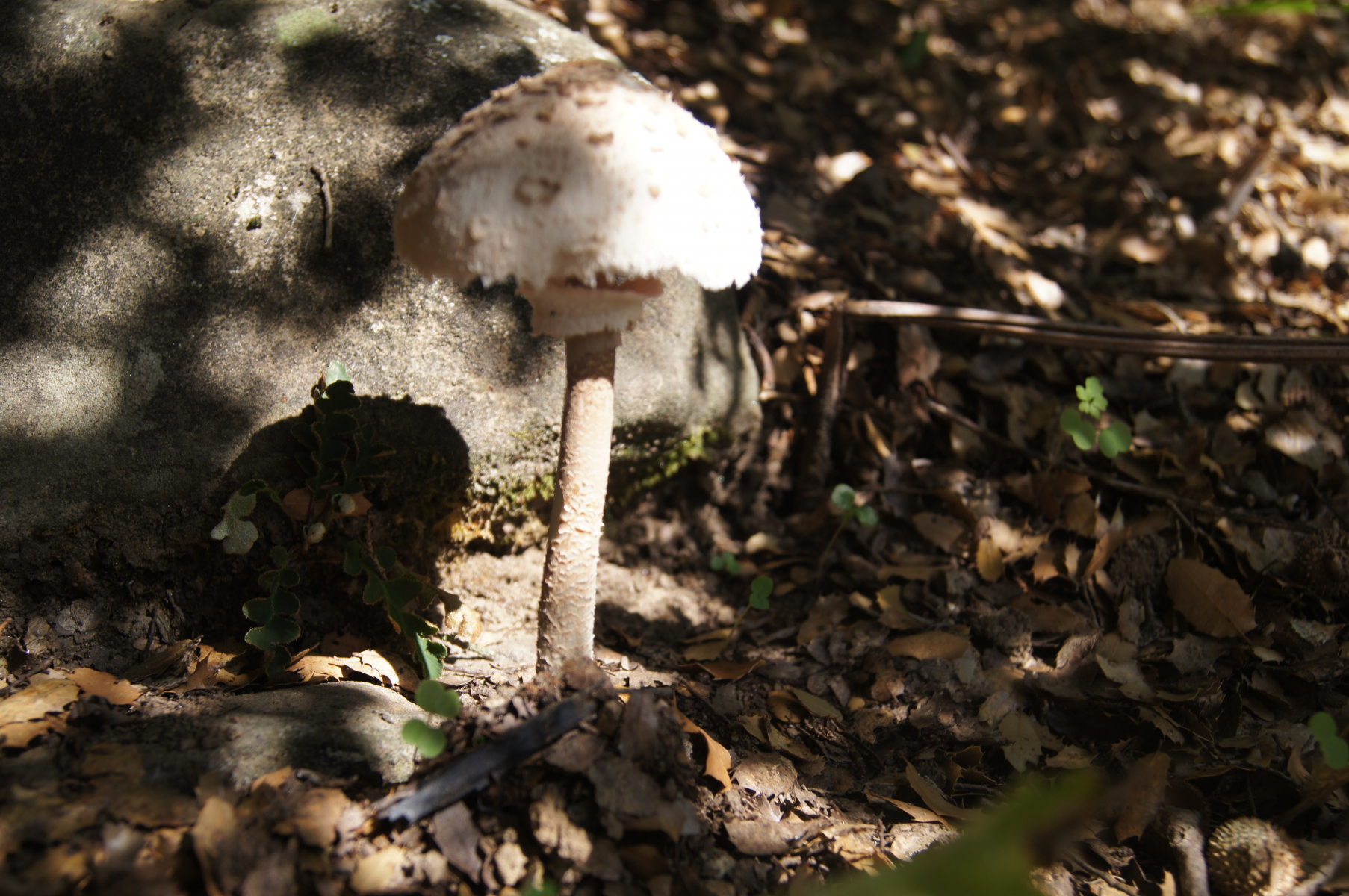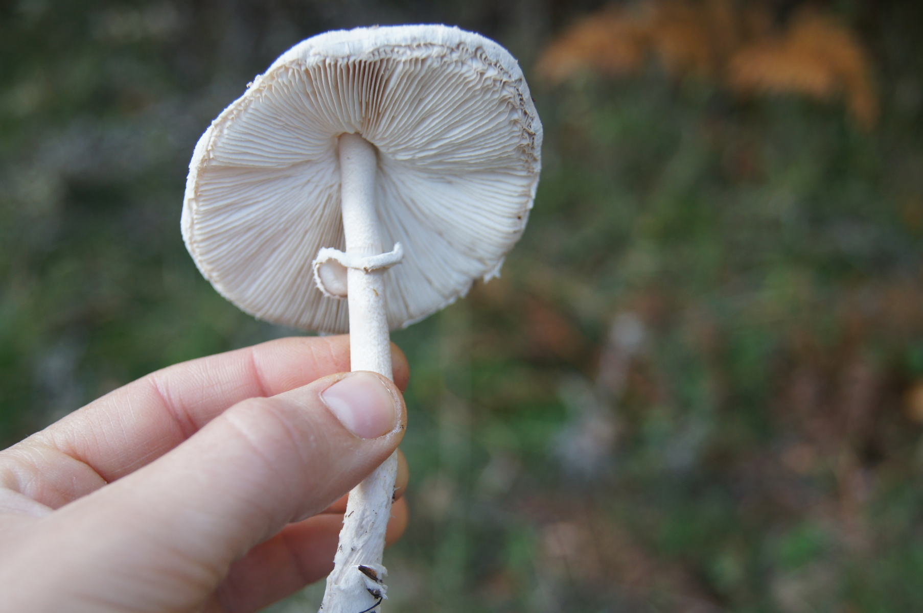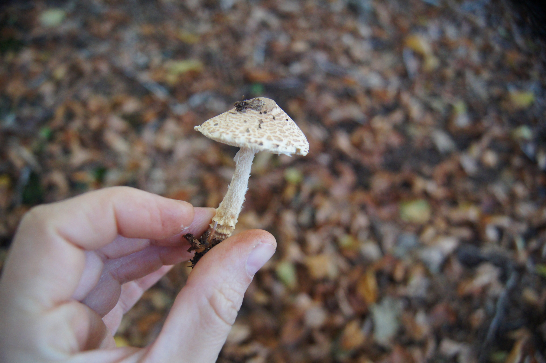 Kurz darauf hielten wir am Straßenrand. Da es relativ steil bergauf ging, blieb Safran zunächst lieber beim Auto und schmökte. Und tatsächlich! Da war auch schon der erste Pilz, ein prächtiger Parasol (hier auf dem Foto allerdings leider nur verschwommen zu sehen):