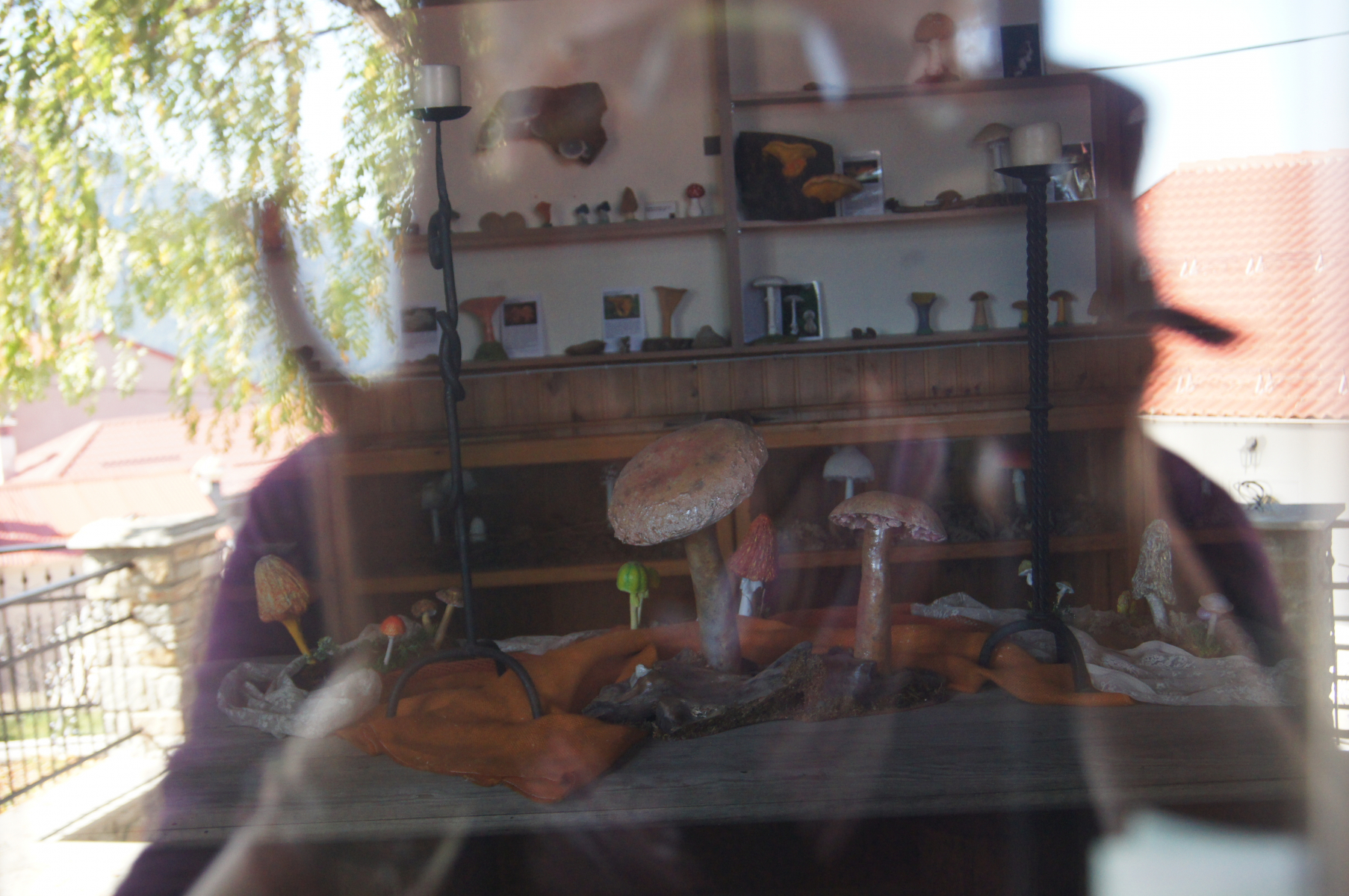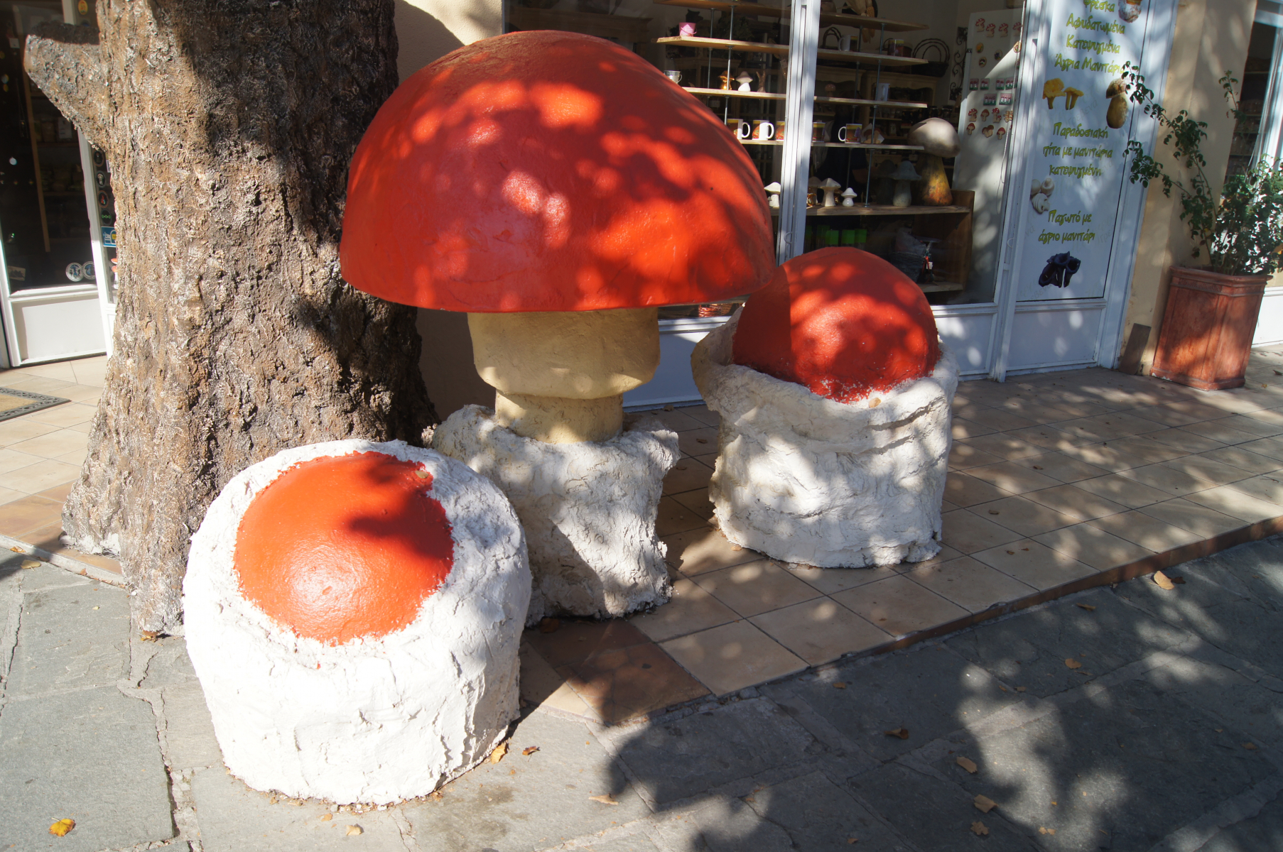 Aber wo war das Pilzmuseum? Im Internet war nur der Name des Ortes, aber keine Adresse angegeben. In dem Dorf sprach niemand Englisch oder eine andere Sprache, die wir konnten. Ich versuchte es mit den acht Silben, die ich am Abend zuvor gemerkt hatte und die idealerweise das griechische Wort für „Pilzmuseum“ ergeben sollten. Die befragte ältere Dame wirkte verwirrt. Dann wiederholte sie die ersten fünf Silben „MANE-TARIA“? und machte mit den Händen Pflückbewegungen auf dem Boden. Wir nickten begeistert. Aber die Dame wirkte nur noch verwirrter als zuvor und zunehmend ratlos, als wir auf ihren fragenden Wortschwall hin nur freundlich mit den Schultern zucken konnten...